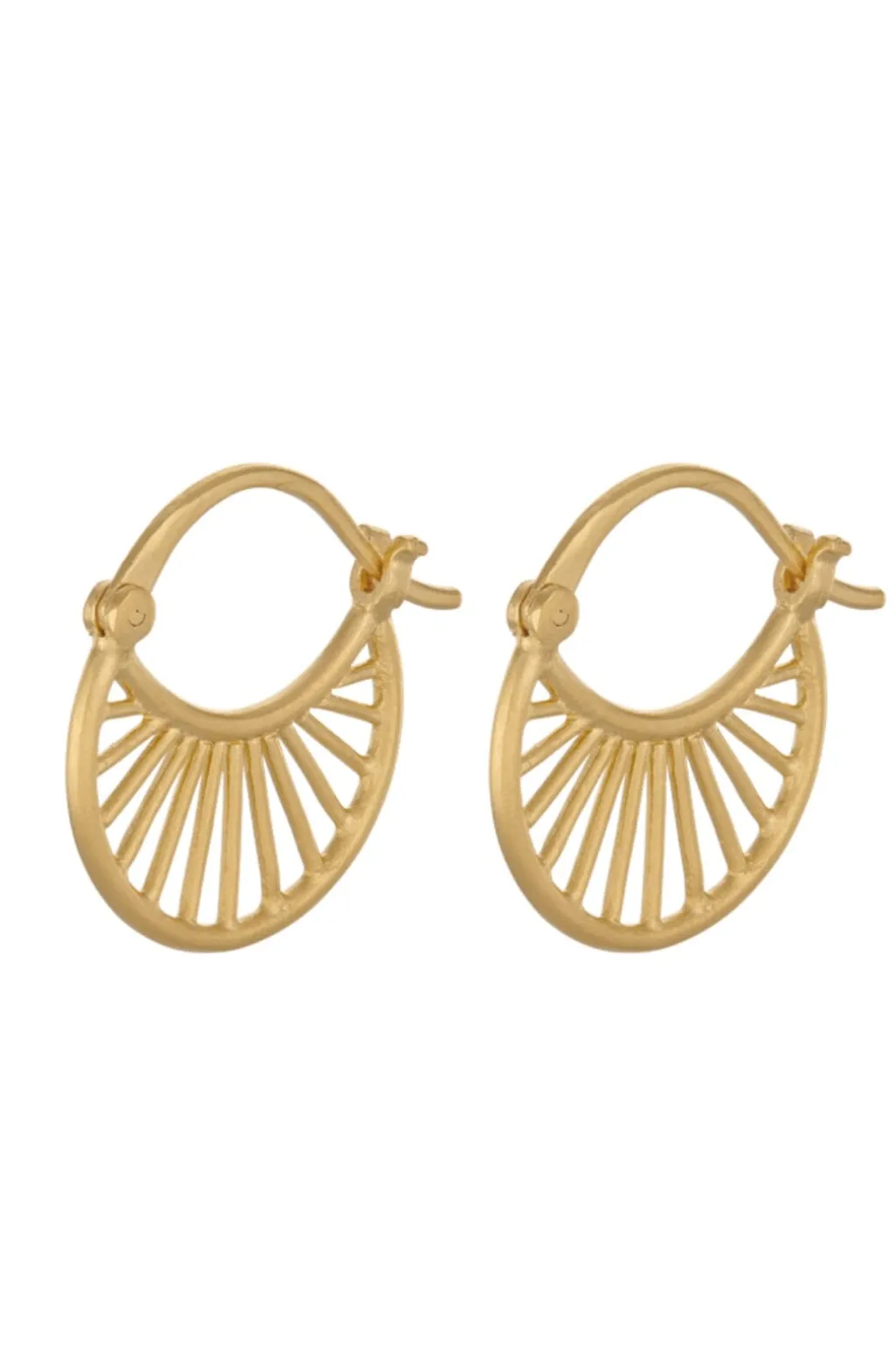 Gyldne øreringe fra Pernille Corydon med et solstråledesign. Øreringene er håndlavet i guldbelagt sterling sølv og har en lille størrelse med stråler, der spreder sig fra midten.