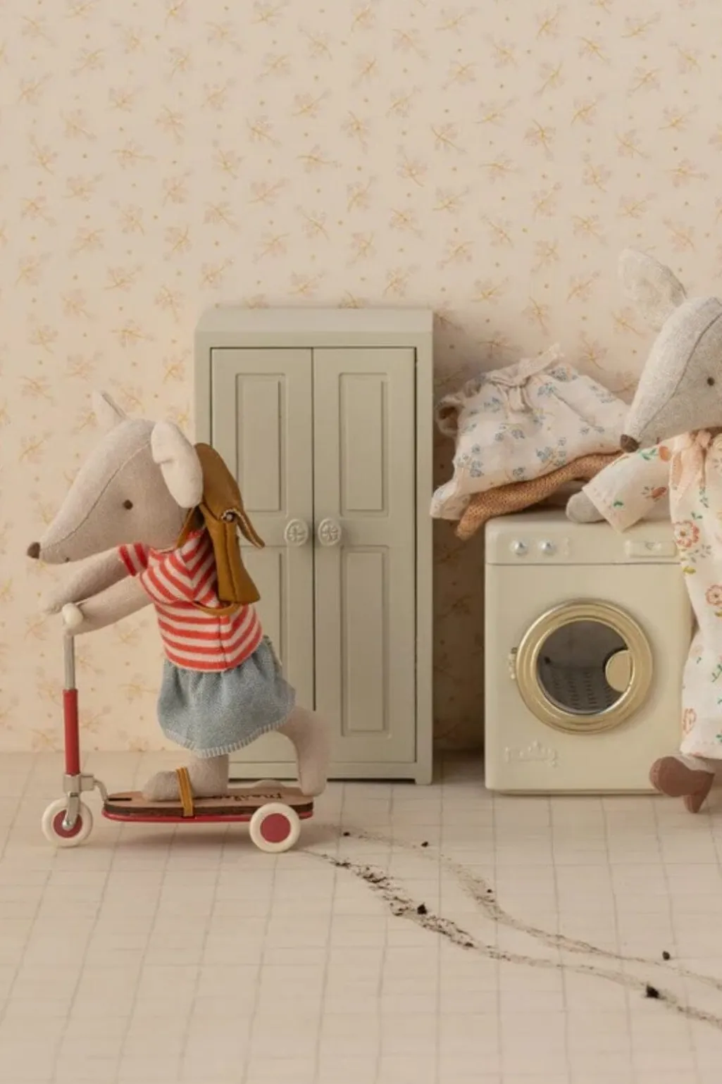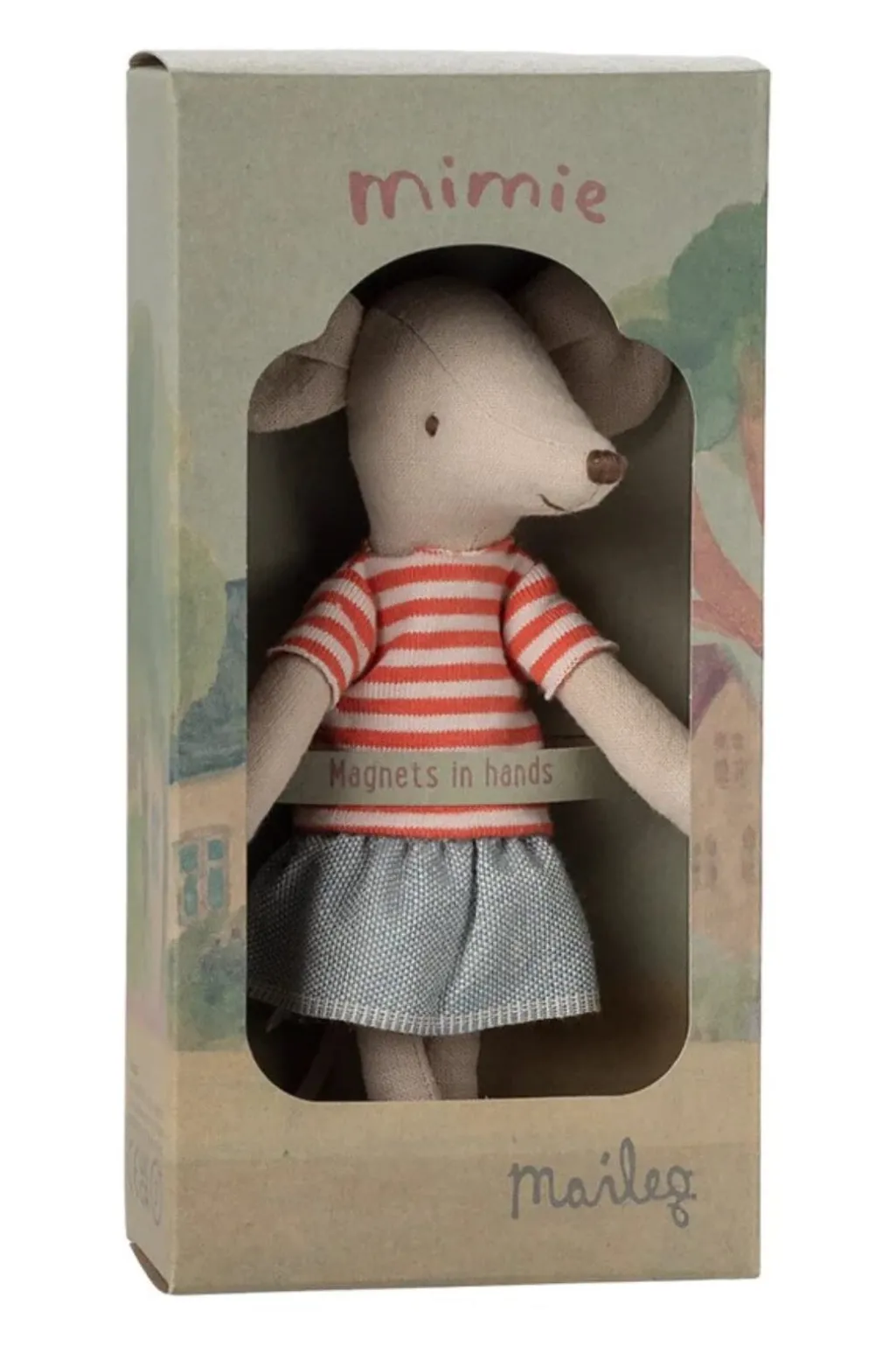 En blød legetøjsmus fra Maileg med rødstribet t-shirt og denimnederdel. Musen har magneter i hænderne og kommer i en dekorativ æske.