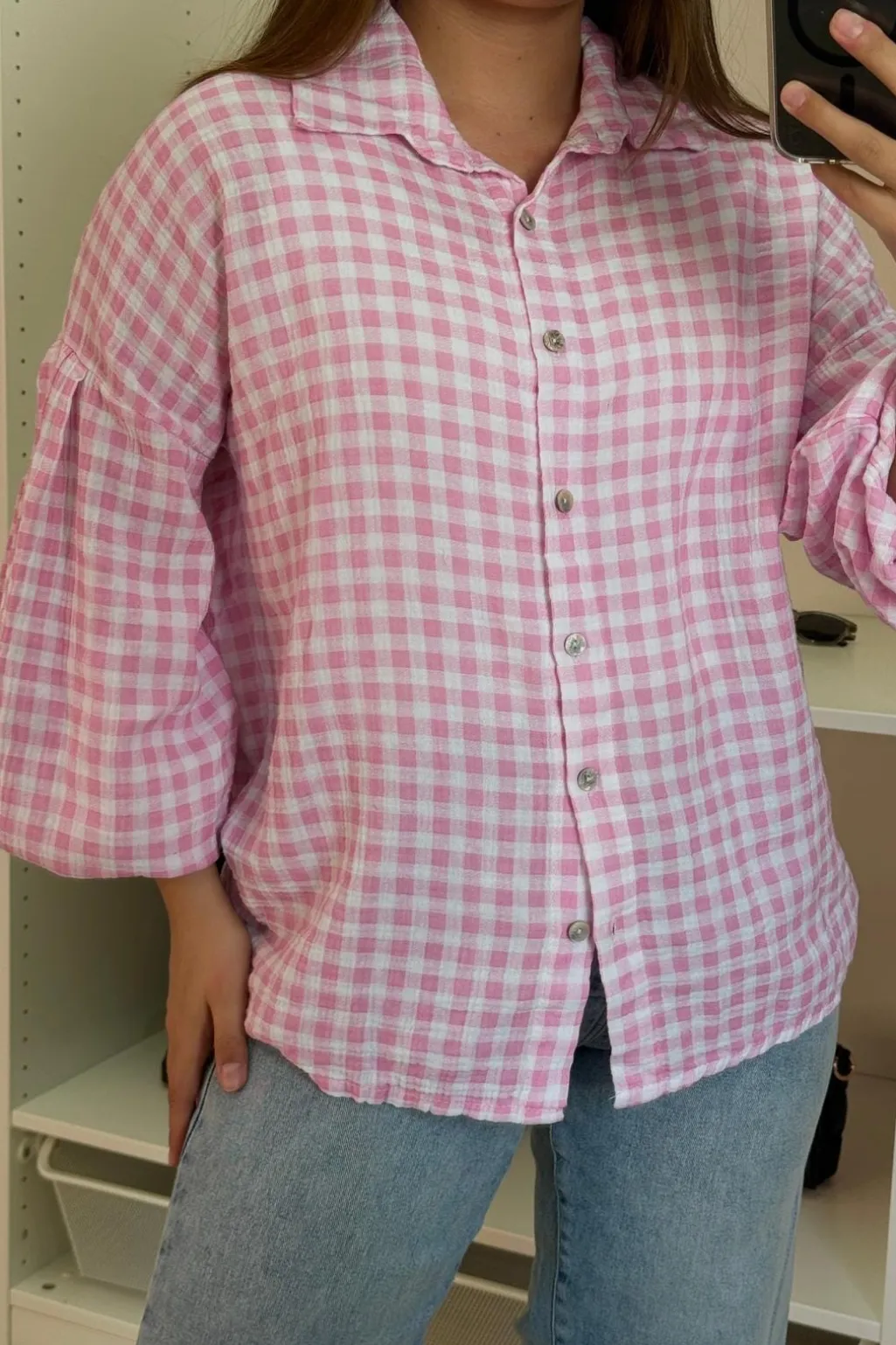 Ternet skjorte fra A-bee i pink og hvid. Skjorten har skjortekrave, knapper foran og perledetaljer. De brede 3/4-ærmer giver et afslappet look.