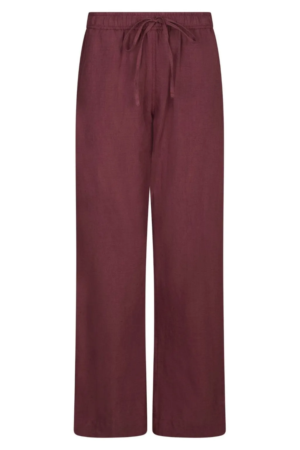 Mørkrosa bukser fra Neo Noir i en blanding af bomuld og hør. Bukserne har brede ben og en elastisk talje med bindebånd.
