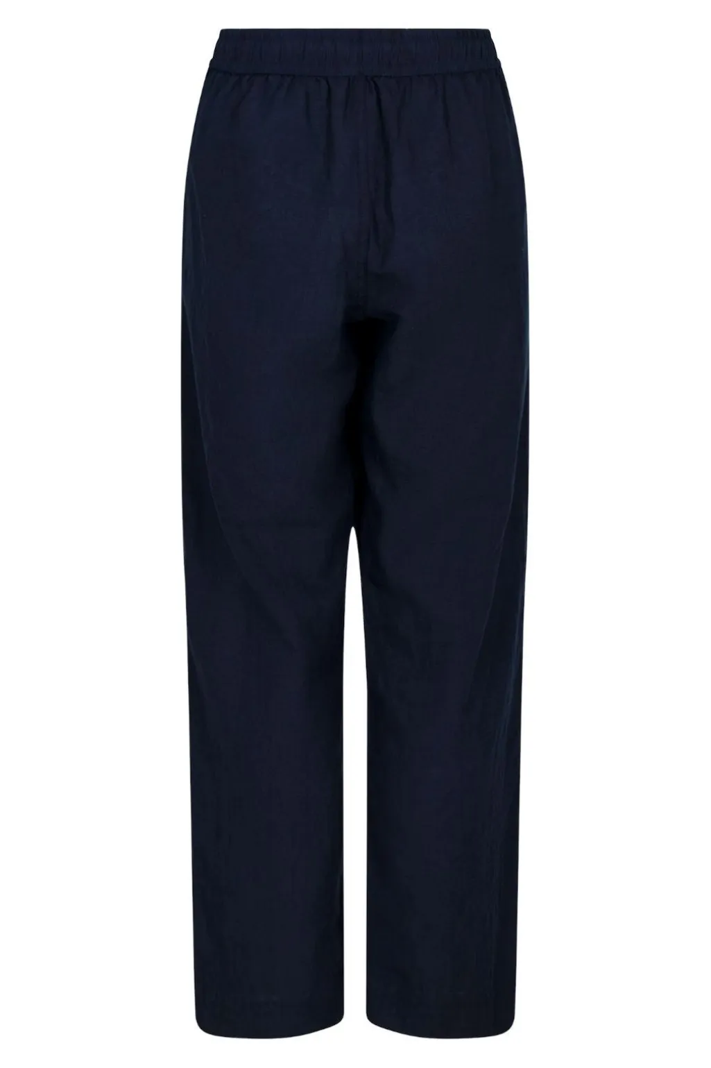 Mørkeblå bukser fra Neo Noir i en blanding af bomuld og hør. Bukserne har brede ben med en løs pasform og elastik med bindebånd i taljen.