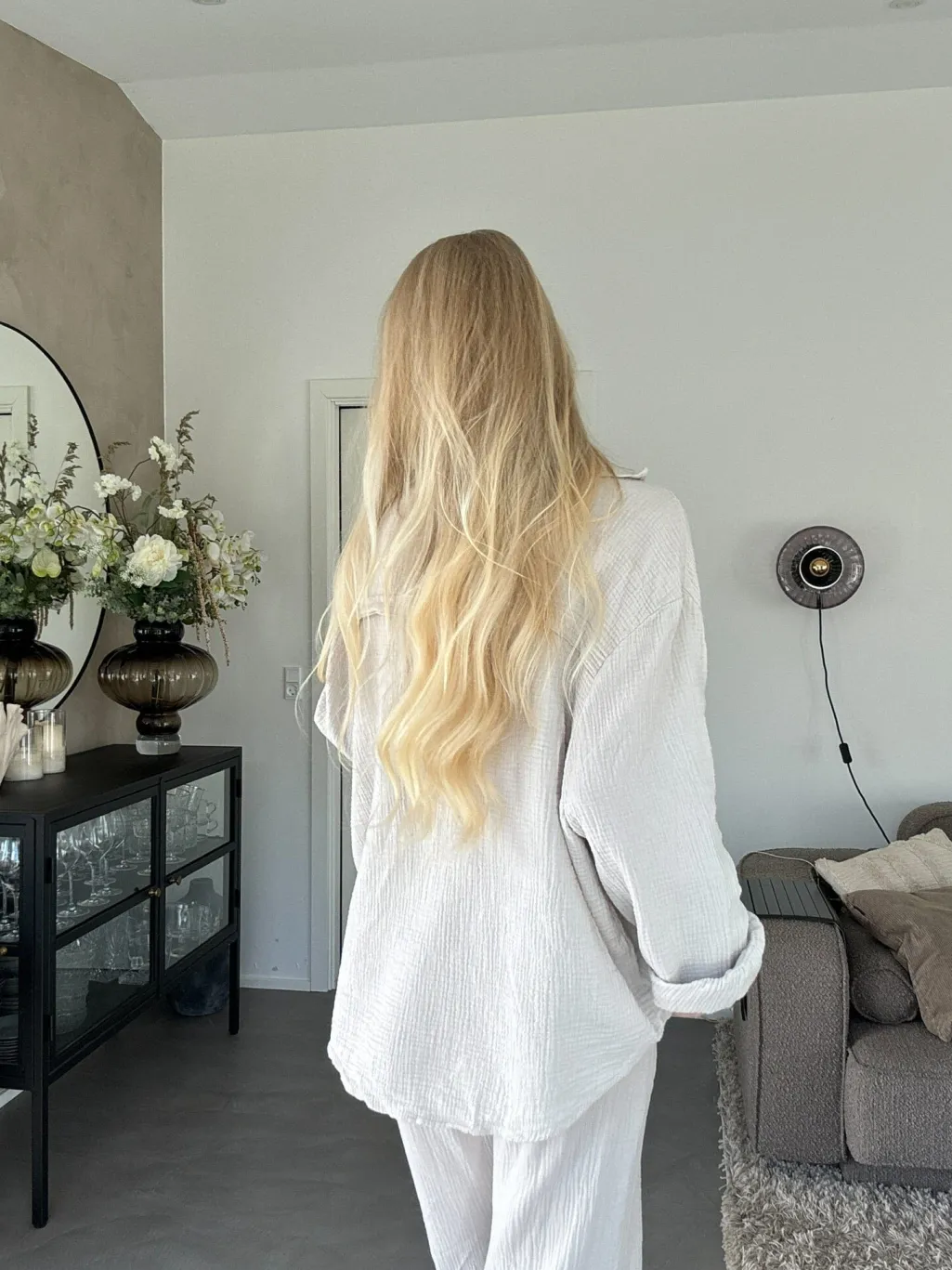 Bukser fra A-bee i en lys ecru-farve. Det rene bomuldsmateriale giver en behagelig fornemmelse mod huden, og den løse pasform sikrer god bevægelsesfrihed.