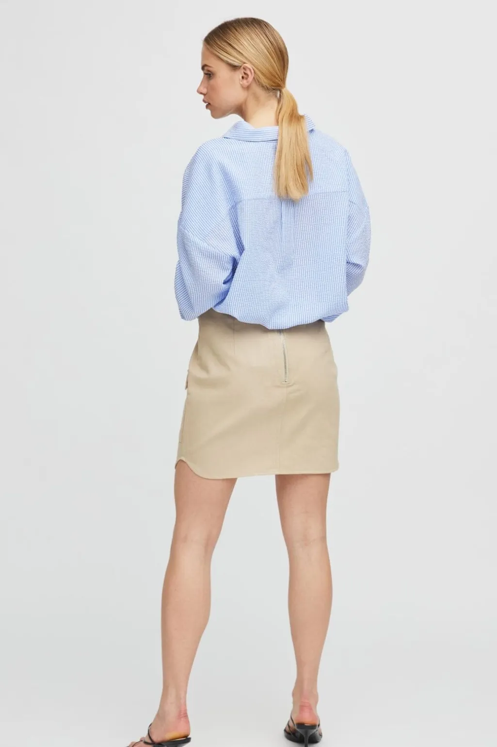 Stribet skjorte fra A-View med blå og hvide striber. Skjorten har en oversize pasform med lange ærmer, skjortekrave og knaplukning hele vejen ned.