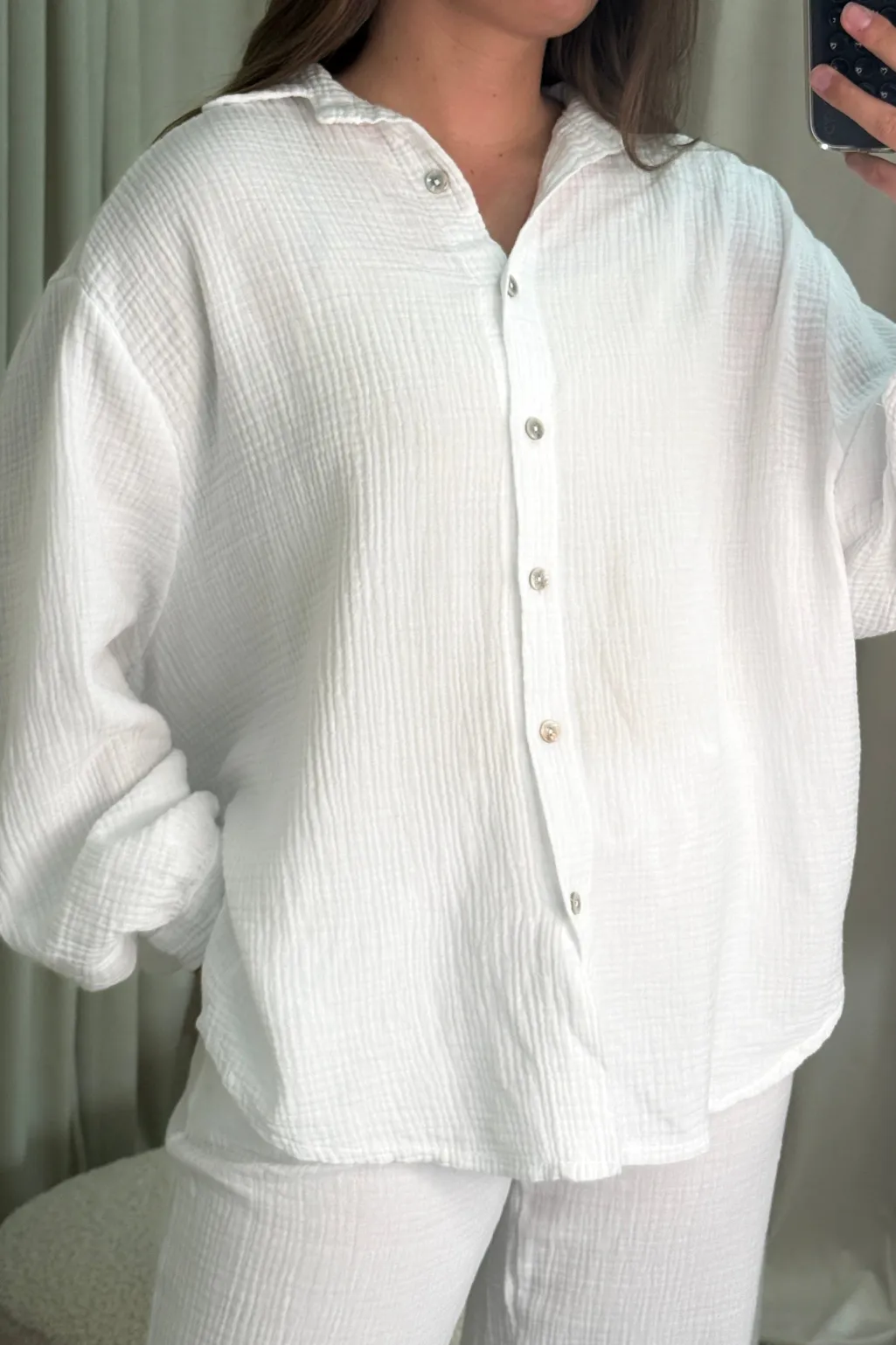 Hvid skjorte fra A-bee med struktureret bomuldsoverflade. Skjorten har en oversized silhuet med knaplukning foran og løse ærmer, der giver god bevægelsesfrihed.