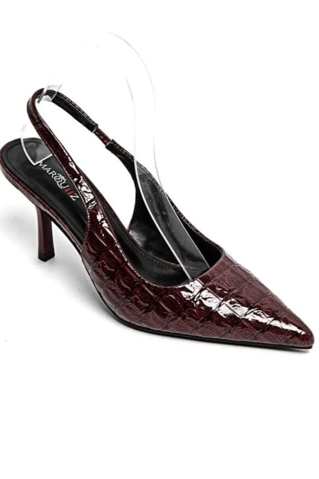 Stiletter fra Bloom i en dyb bordeauxfarve. Overfladen har et krokodillemønstret præg, og skoen har en spids tåform samt en slingback-strop.