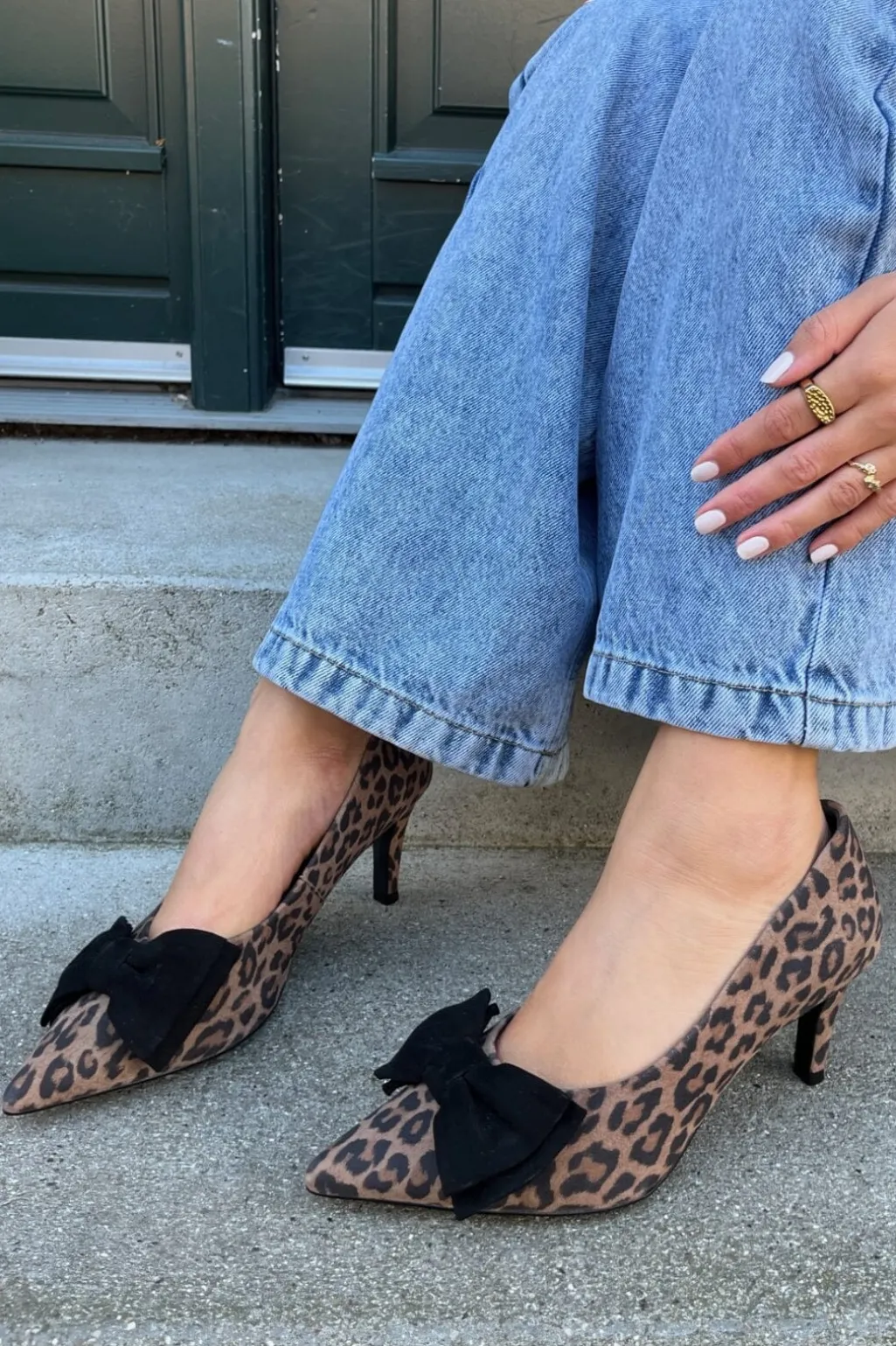 Stiletter fra Copenhagen Shoes i ruskind med leopardprint. Skoene har en spids tå og en sort sløjfe foran, der giver dem et personligt præg.