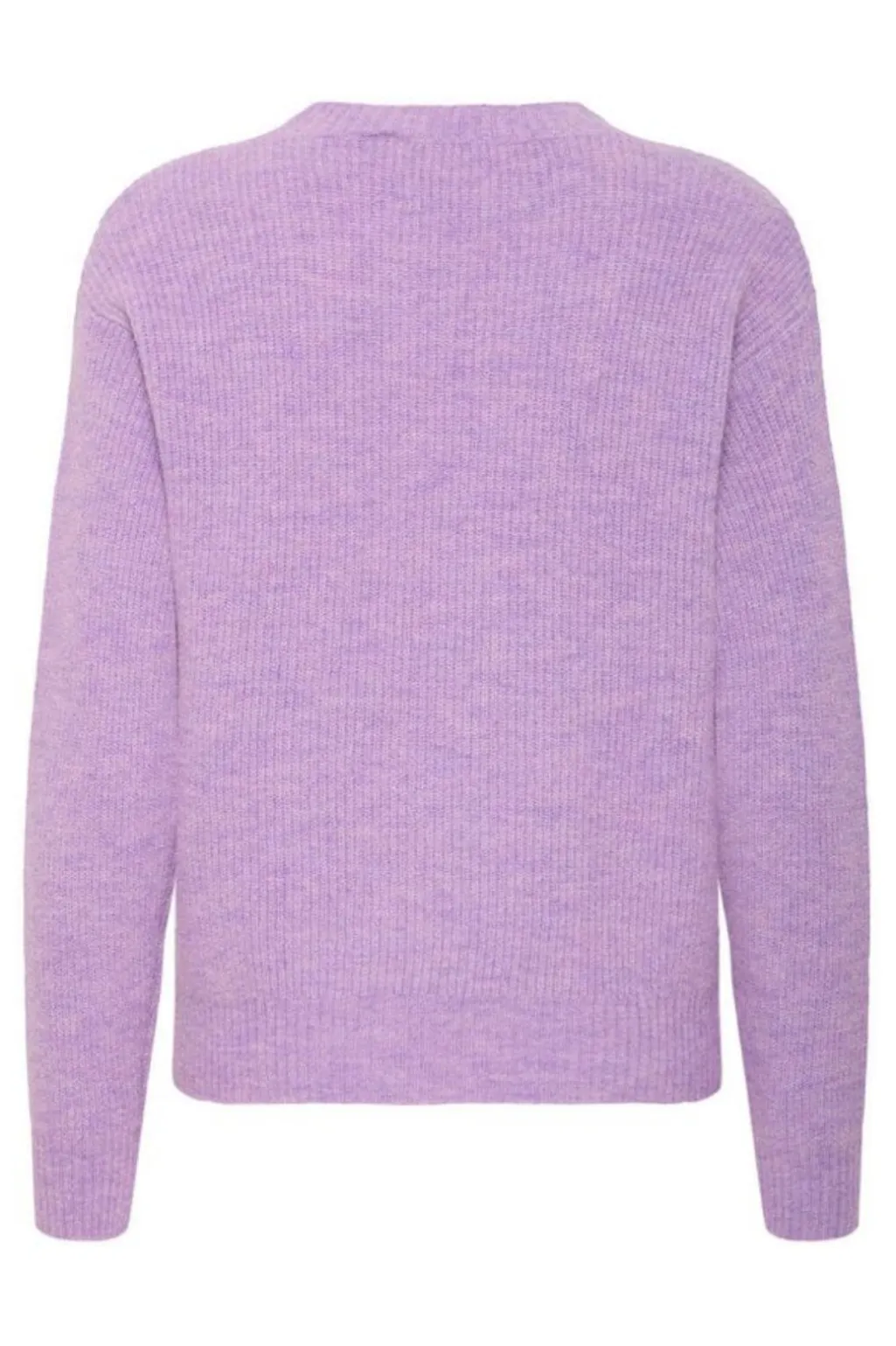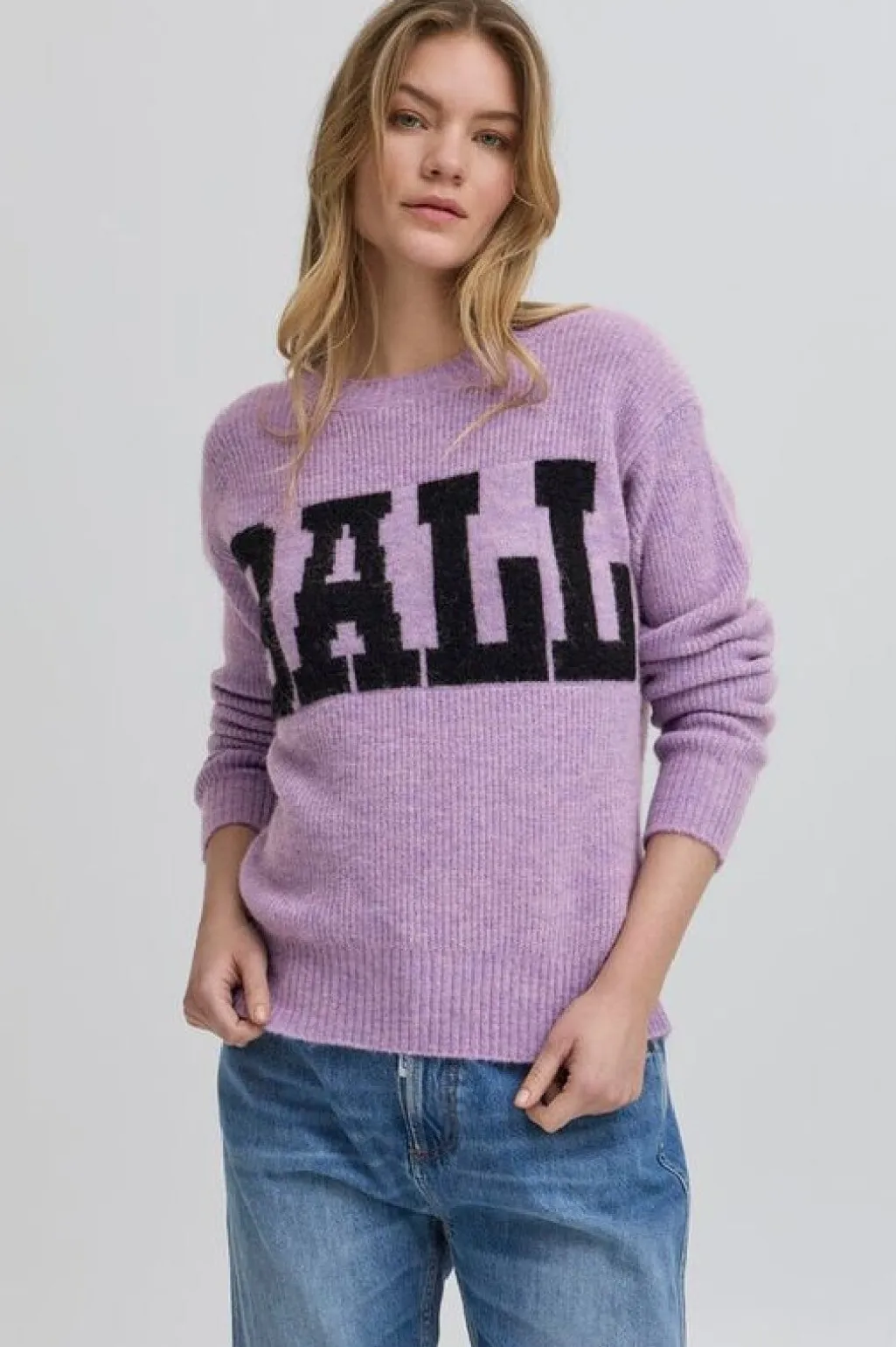 Lys lilla pullover fra Ball med lange ærmer og ribbede manchetter. Den sorte BALI-tekst på brystet skaber en flot kontrast til den lyslilla farve. Sweateren har en løs pasform.
