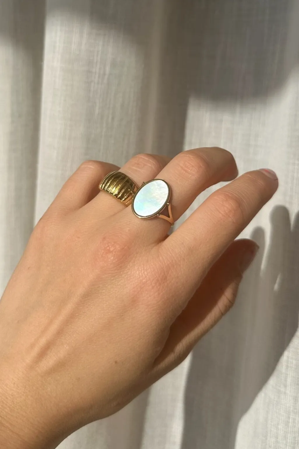 Gylden ring fra Anobel Copenhagen med en struktureret overflade. Ringen har et skandinavisk design med et mønster, der giver den et særpræg.