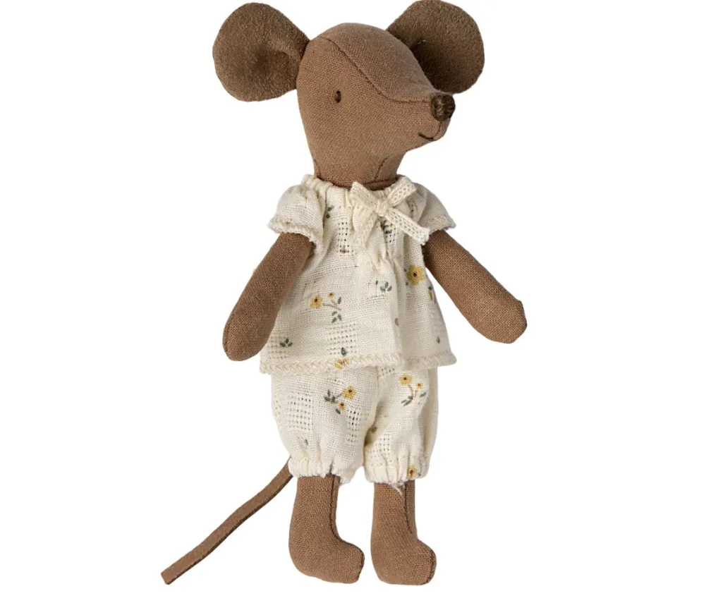 En klassisk Maileg-vare. Denne mus er klar til timevis af leg og sover godt i tændstikæsken. Tøjet og sengetøjet kommer i unikke mønstre og smukke farver.