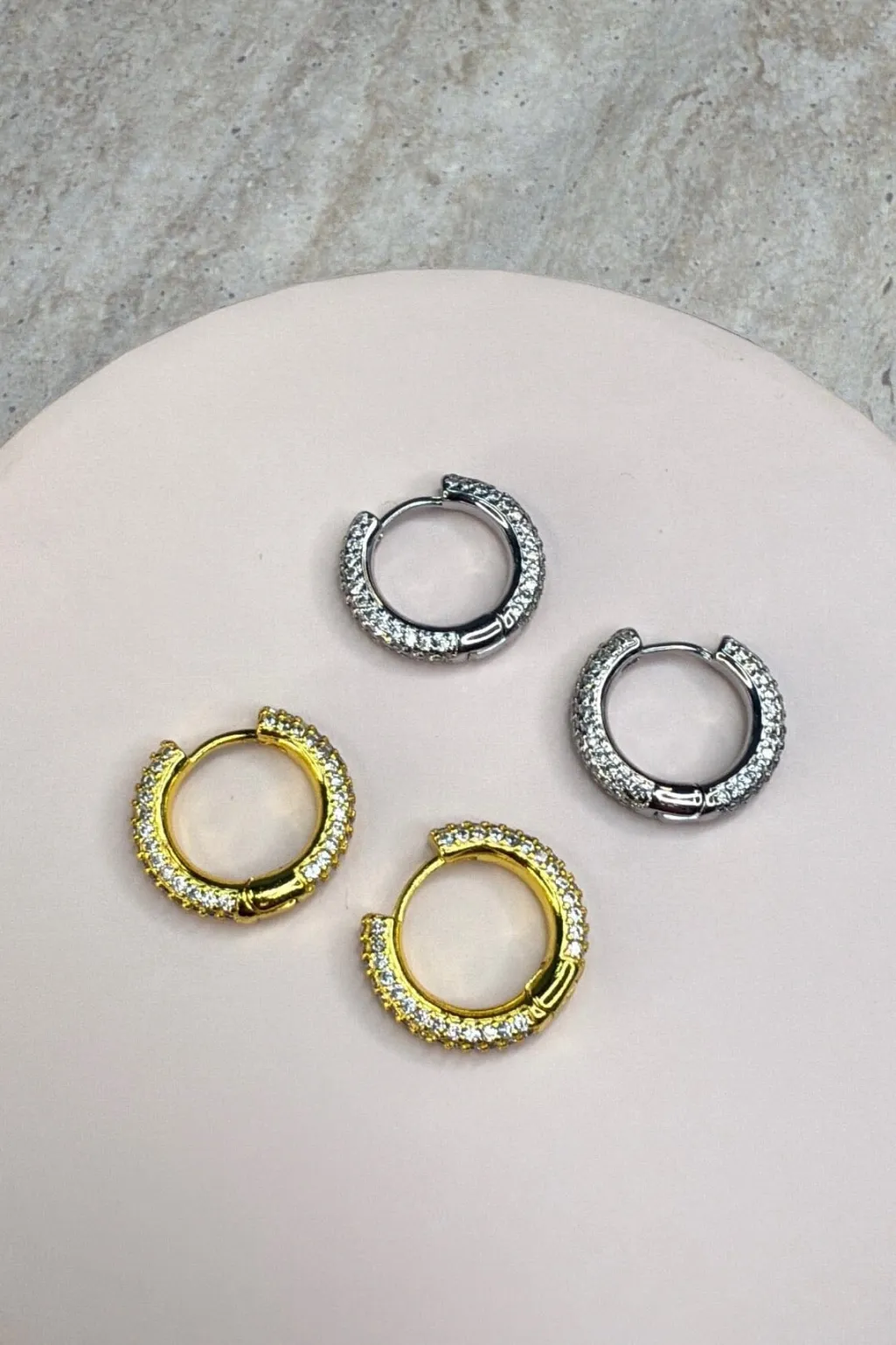 Cirkulære øreringe fra Molly&My Jewellery i en sølvfarvet nuance. Øreringene er dekoreret med små sten hele vejen rundt.