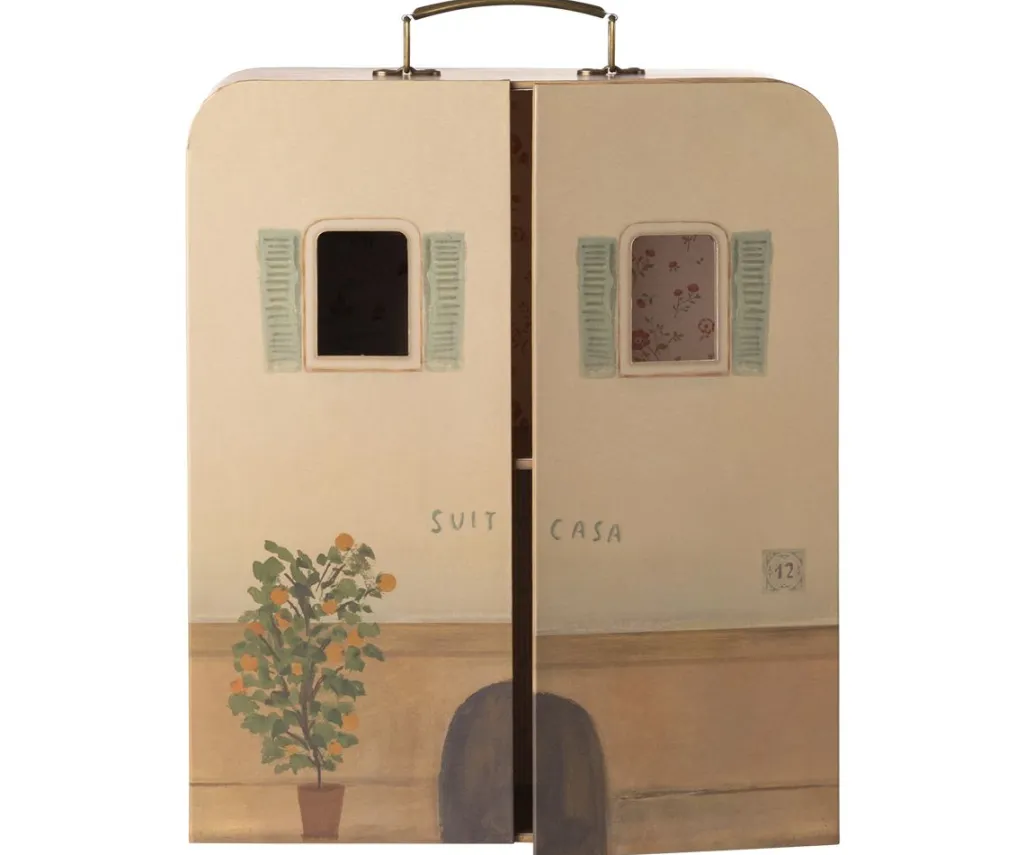 En kuffert med dukkehus fra Maileg med flere rum dekoreret med forskelligt tapet. To musedukker i henholdsvis stribet bluse og t-shirt er inkluderet.