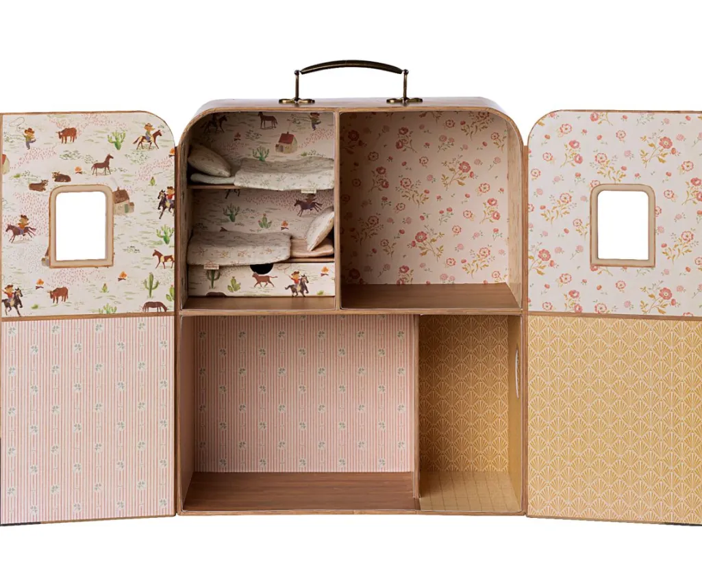 Rummene er dekoreret med forskelligt tapet, som skaber separate områder til leg. Kufferten åbner op og fungerer som en miniatureverden til fantasifuld leg.