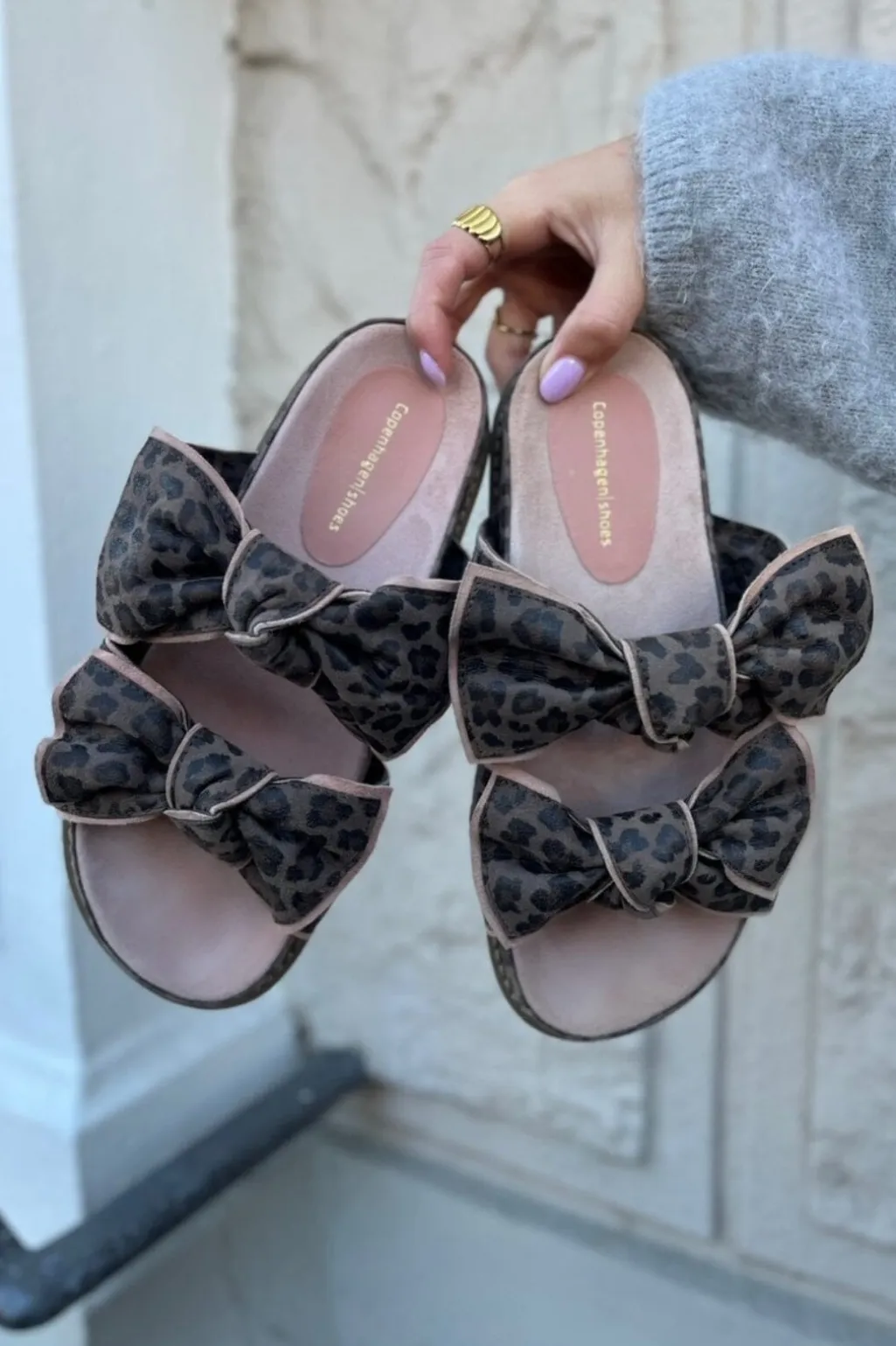Sandaler fra Copenhagen Shoes i ruskind med leopardprint i grå og fersken nuancer. Designet har store sløjfer på stropperne og en lav sål.