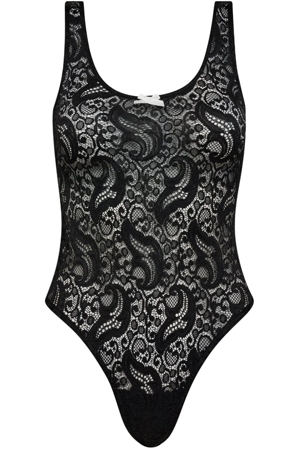 Sort body fra Haute L’Amitié med blonde i paisley-mønster. En lille hvid sløjfe ved halsudskæringen giver et feminint touch.