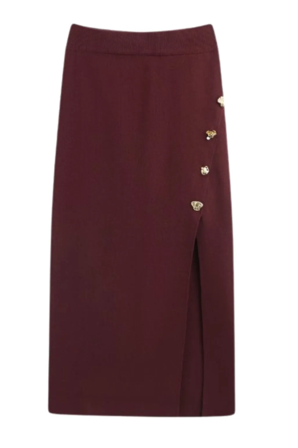 Bordeauxfarvet nederdel fra A-bee med høj talje og en længde til midt på læggen. Den dybe bordeauxfarve er ensfarvet.