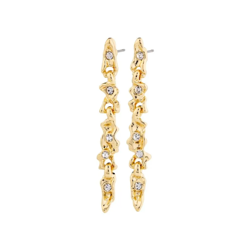 Guldbelagte øreringe fra Pilgrim med indlagte krystaller. De aflange øreringe har et kædelignende design med krystaller placeret langs hele længden.