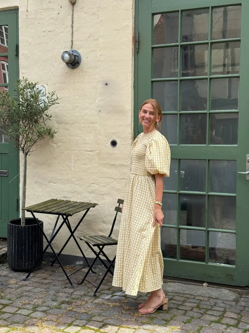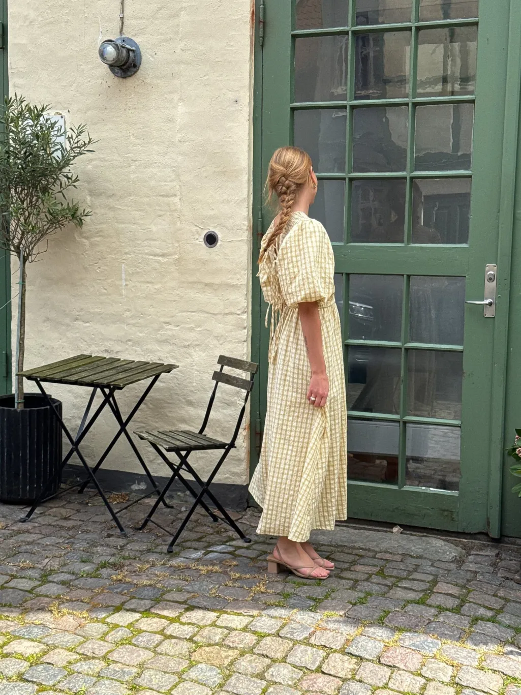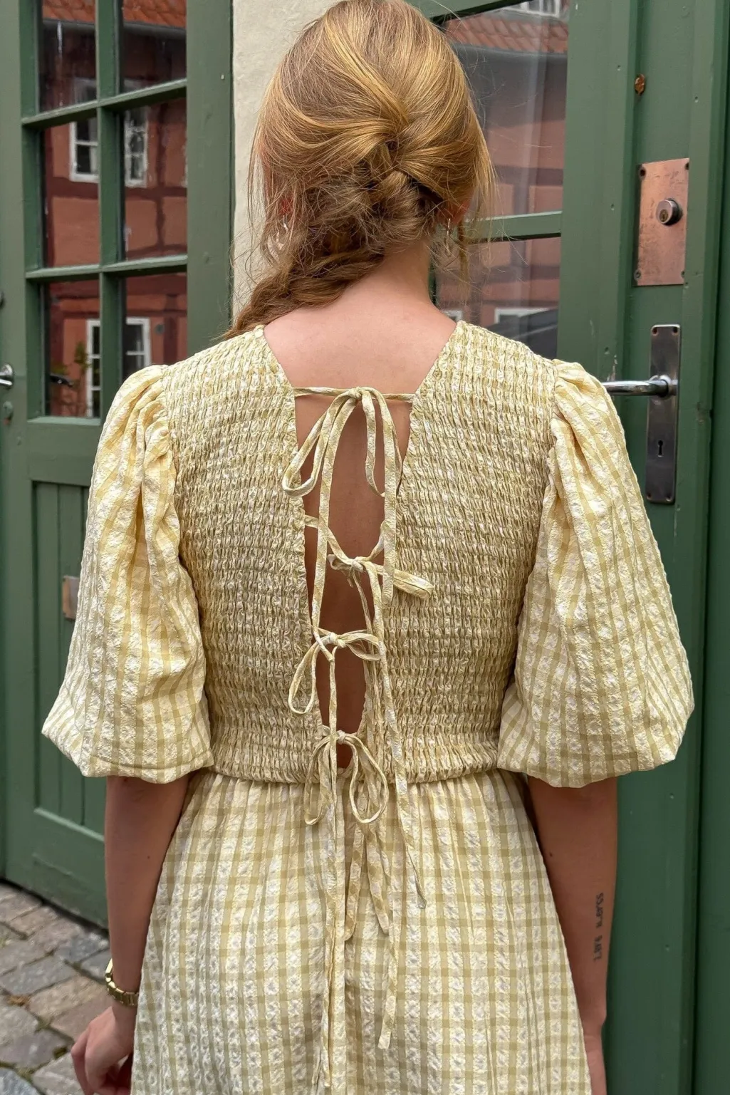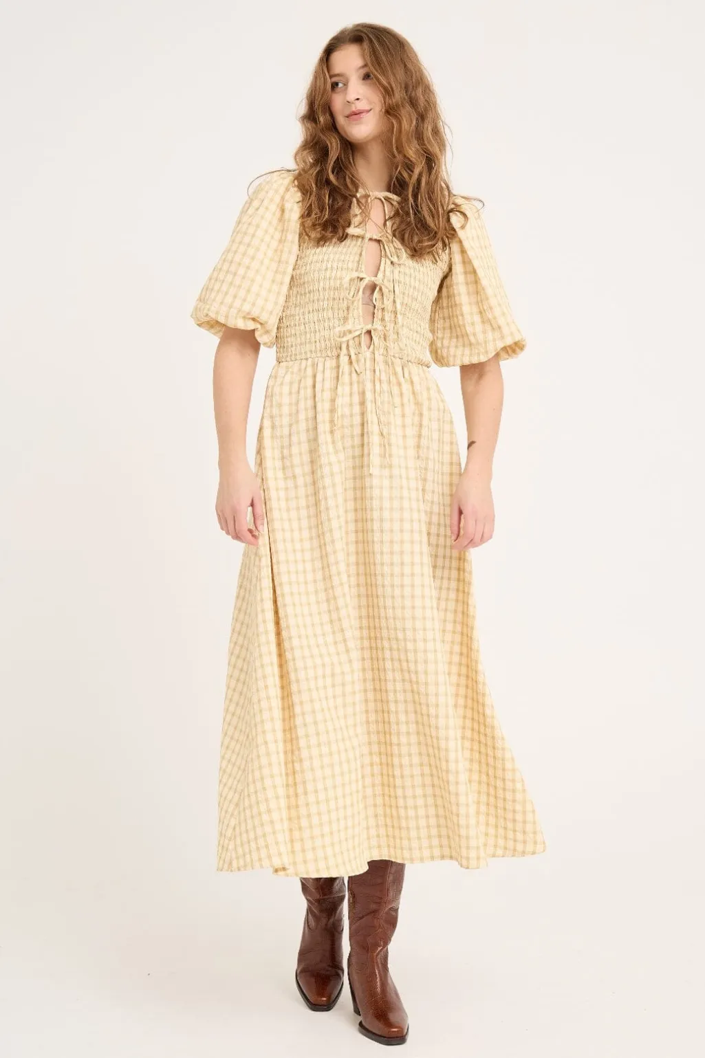 Lang kjole i lys gul med ternet mønster. Kjolen har smock-detaljer i livet og bindebånd på ryggen. De puffede ærmer og den lange længde giver kjolen et sommerligt udtryk.
