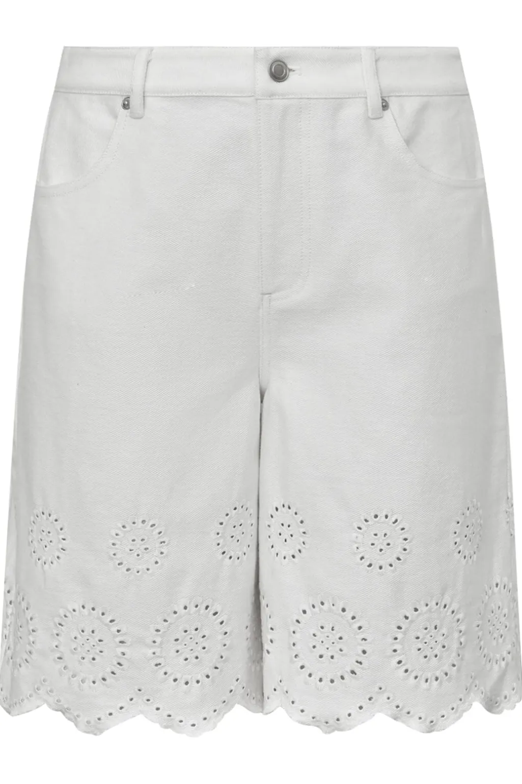 Hvide shorts fra Global Funk med scallop-kant og blomsterudskæringer langs bunden. Shortsene har lynlås og knapper i front samt lommer både foran og bagpå.
