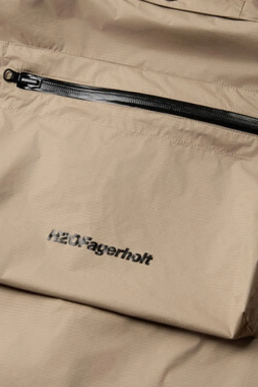 Sandfarvet regnfrakke fra H2O Fagerholt i let nylon. Den høje hals og lynlåslukning giver god beskyttelse mod regn og vind.