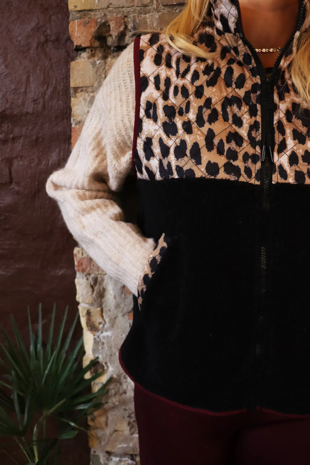 Teddy-vest fra Liberte i farven Lux Leo Black Bordeaux. Vesten har leopardmønster øverst og en sort sektion nederst med lynlås foran.