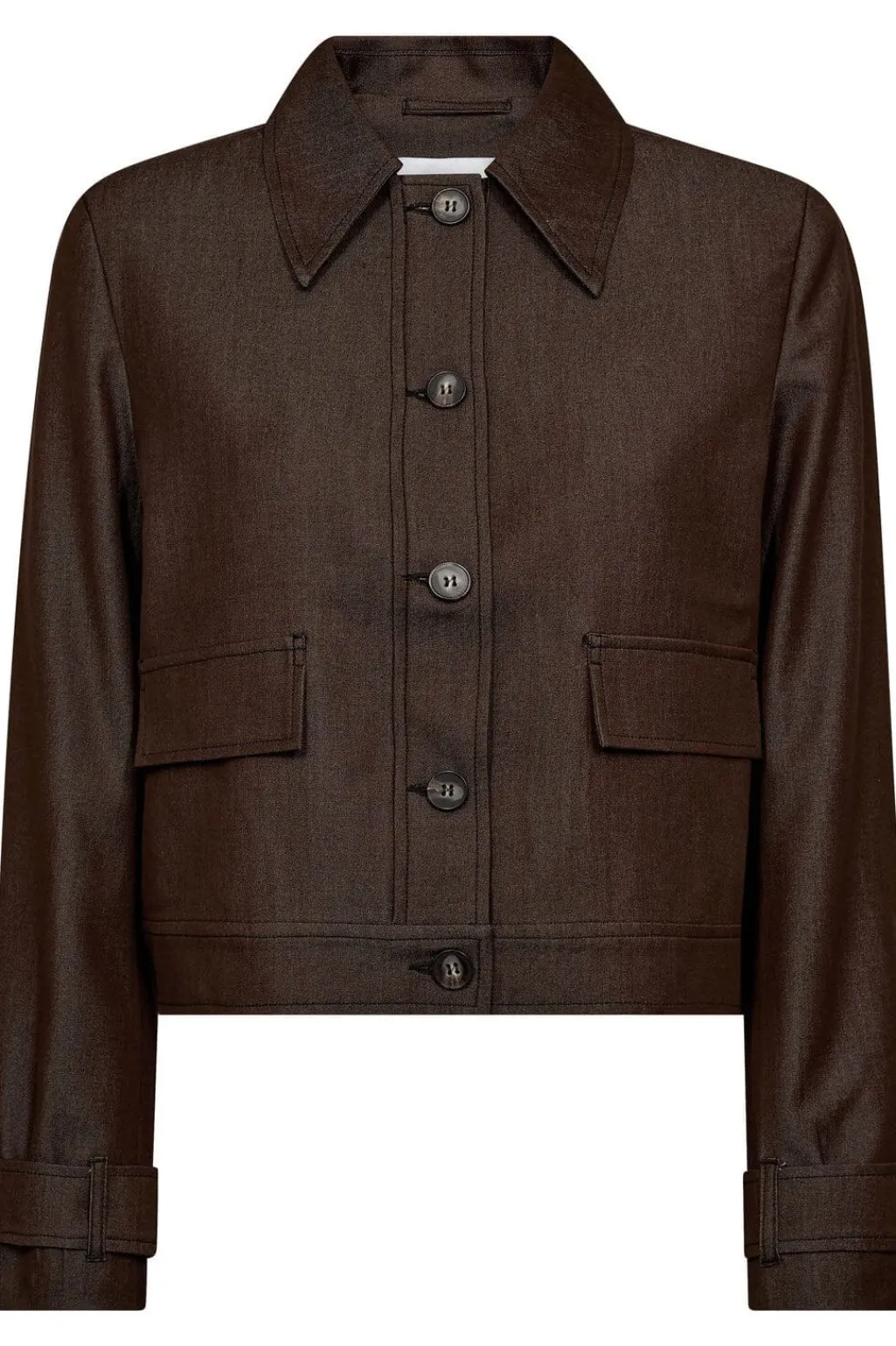 Mørkebrun denimjakke fra Co´Couture med skjortekrave og lange ærmer. Jakken har knaplukning og dekorative syninger, der giver den et detaljeret udtryk.