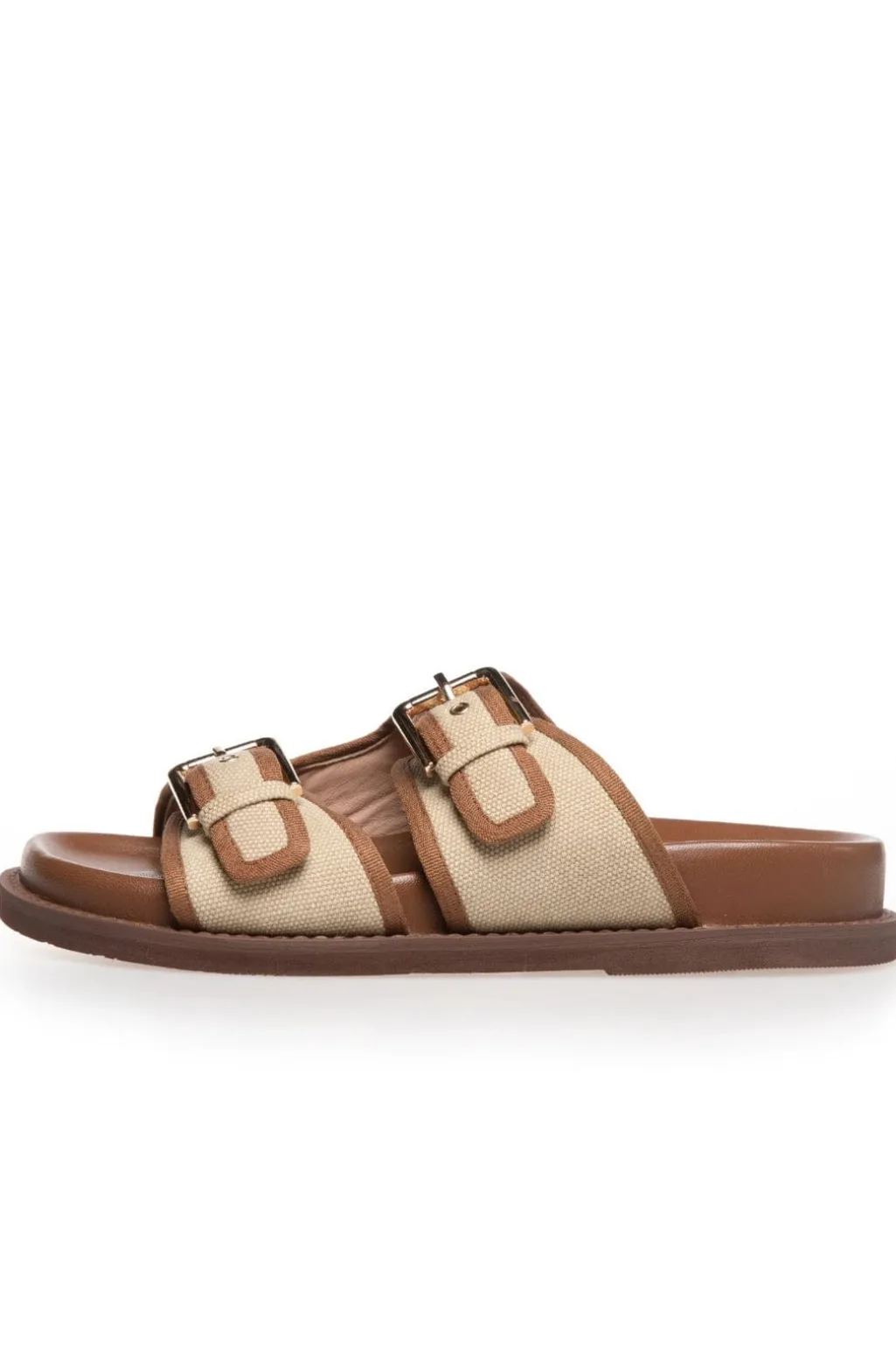 Sandal i let tekstil fra Copenhagen Shoes. En beige og cognacfarvet model med spænder og lav hæl. Skoen har et let og luftigt design med praktiske detaljer.