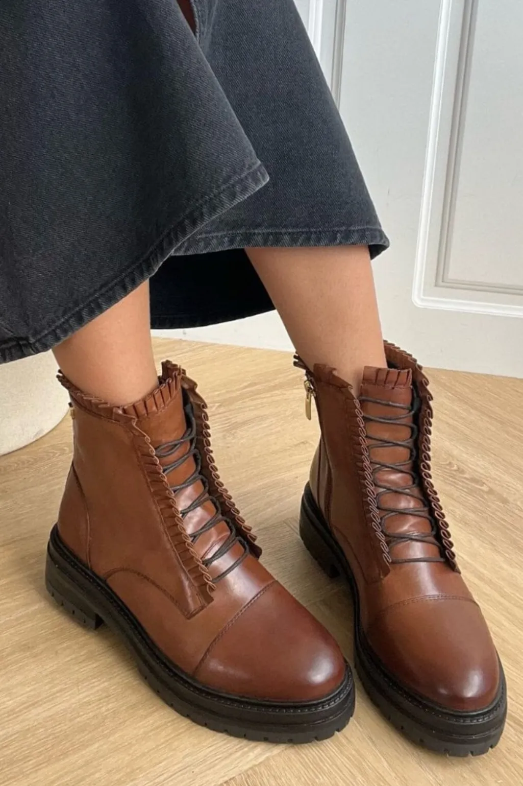 Brun ankelstøvle fra Copenhagen Shoes i blødt læder med flæsekant og rynkeeffekt. Støvlen har både snørebånd og lynlås samt en sort TPR-sål med god skridsikkerhed.