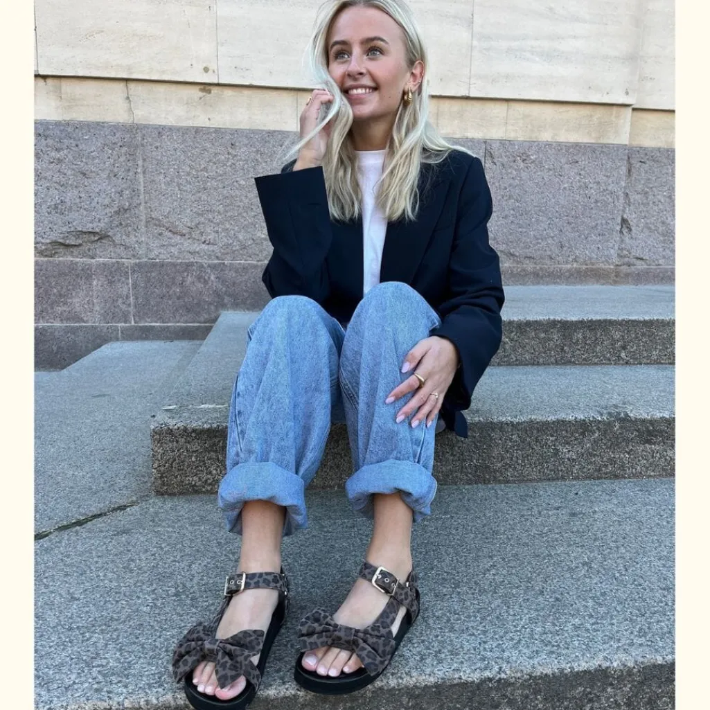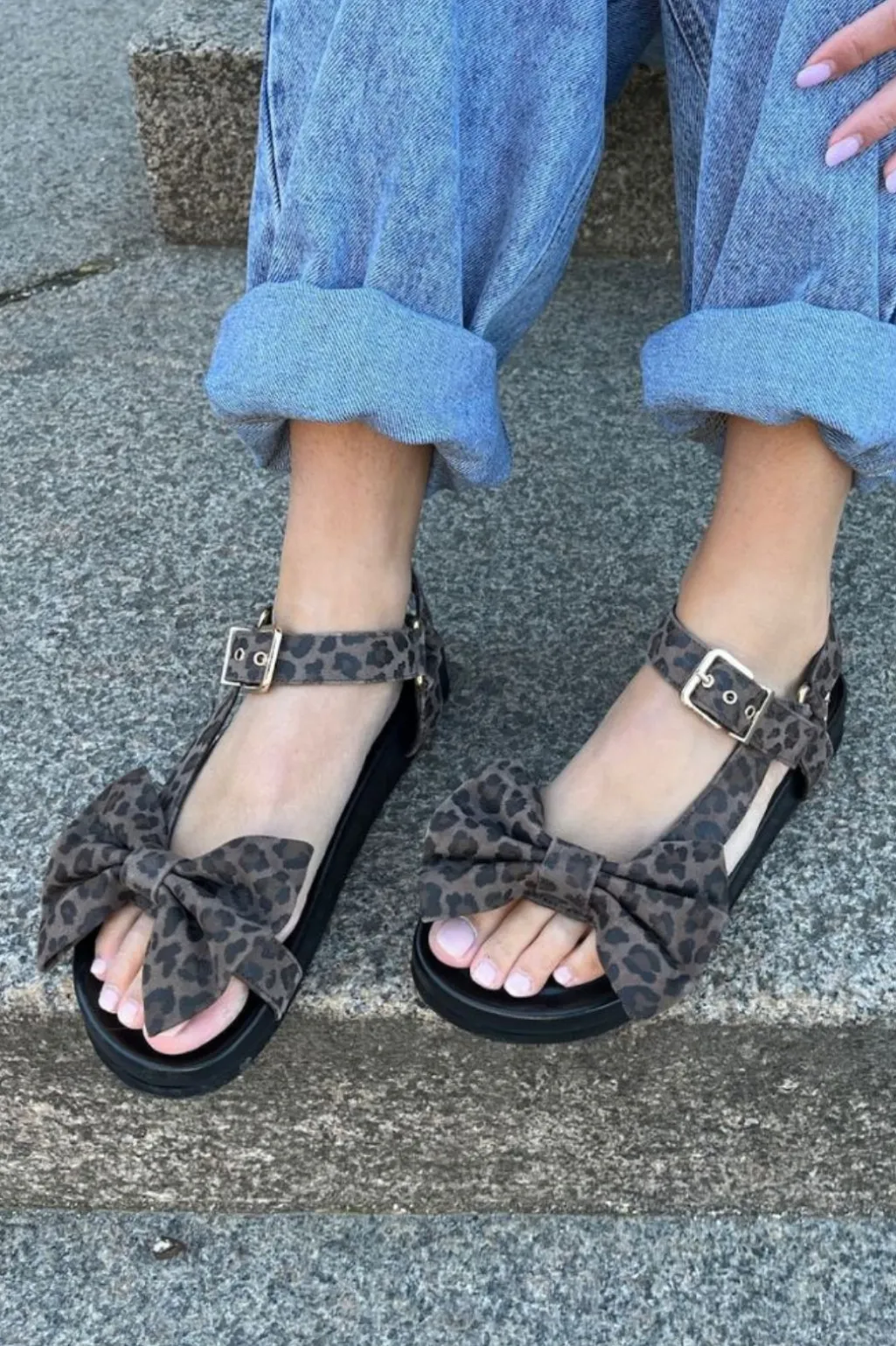 Sandal fra Copenhagen Shoes i ruskind og læder med leopardprint i nuancen Mouse. Den store sløjfe foran og spænde-lukningen giver sandalen et feminint udtryk.