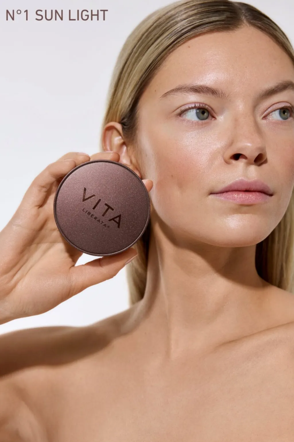 Mineralpudder bronzer fra Vita Liberata. En løs pudder, der giver huden en naturlig glød. Den er både vegansk og talkumfri.