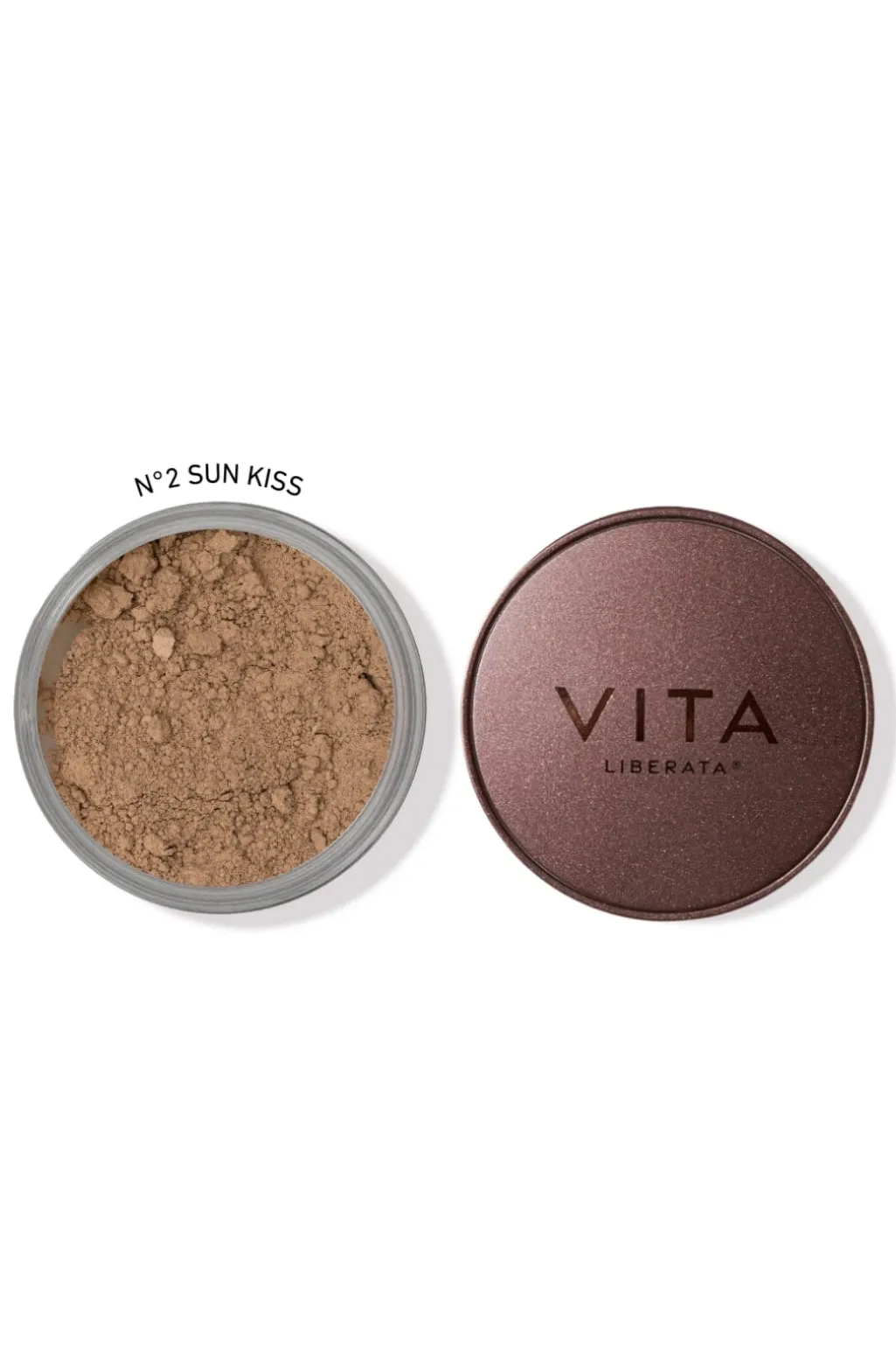Mineralpudder fra Vita Liberata i farven Sun Kiss Medium. Denne bronzer giver en naturlig glød og kan anvendes som mineralpudder til hele ansigtet.