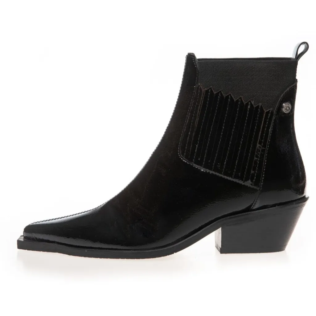 Sort ankelstøvle fra Copenhagen Shoes med blank patentoverflade. Støvlen har en spids tå og en lav blokhæl, der gør den stabil at gå i.