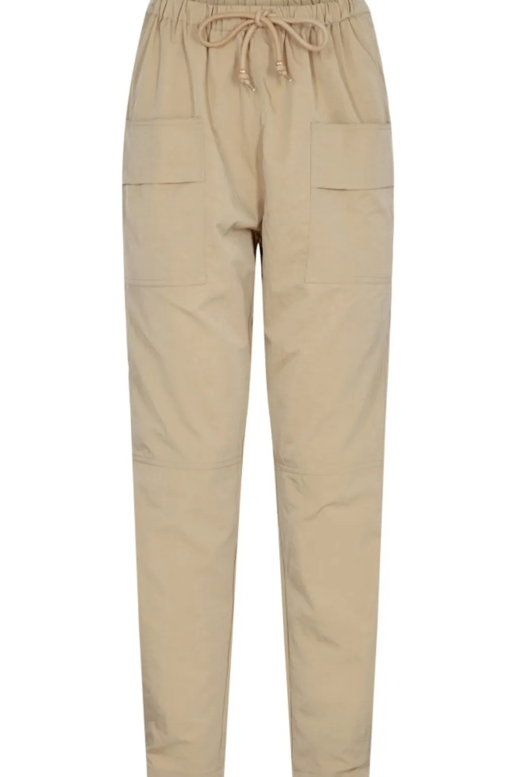 Bukser fra Gossia i camelfarvet stof med loose fit. Bukserne har en høj talje med elastik og bindebånd samt praktiske lommer foran.