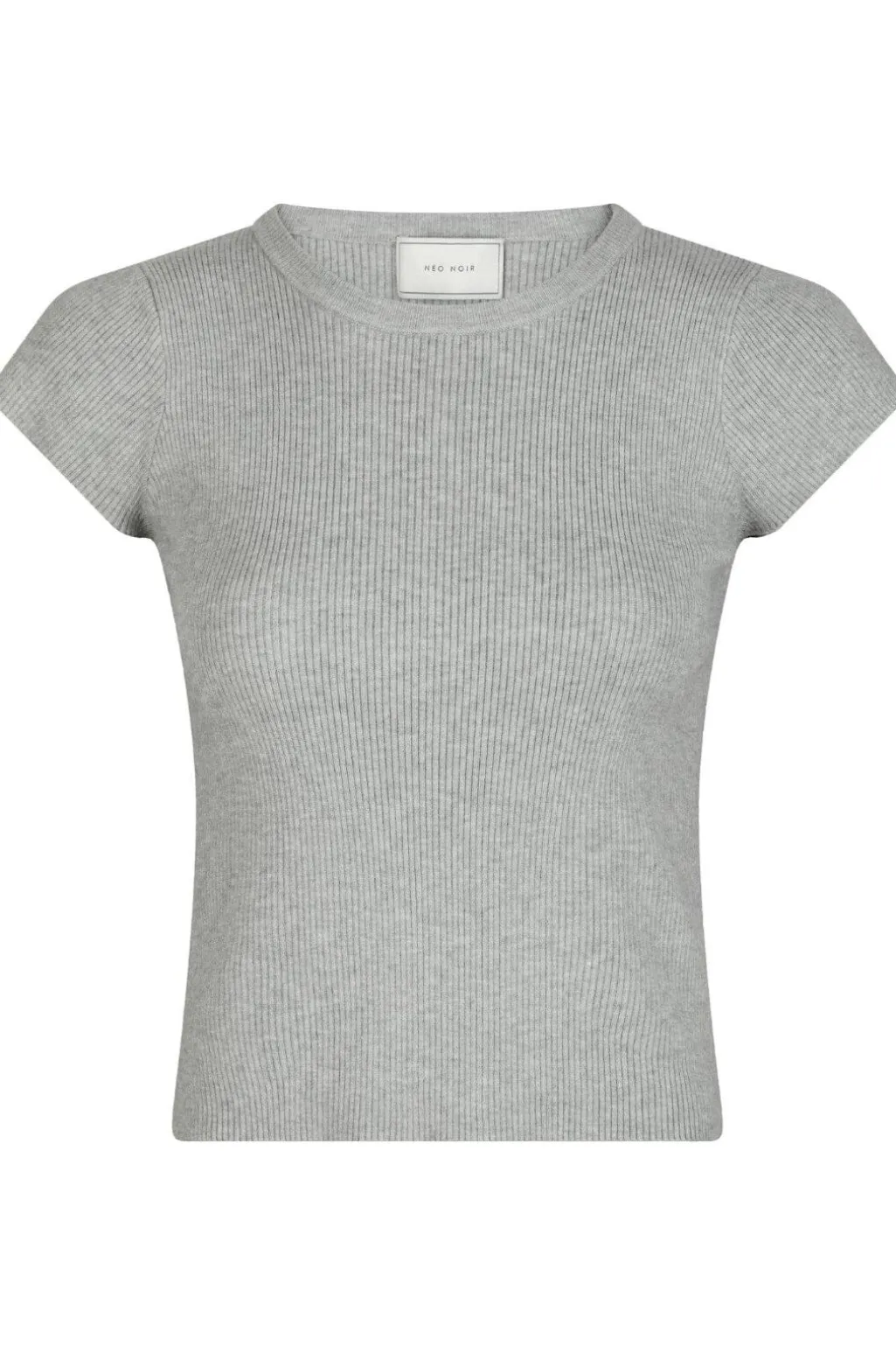 Lys grå strikket t-shirt fra Neo Noir med ribbet tekstur. T-shirten har en rund hals og korte ærmer med en tætsiddende pasform, der følger kroppens form.