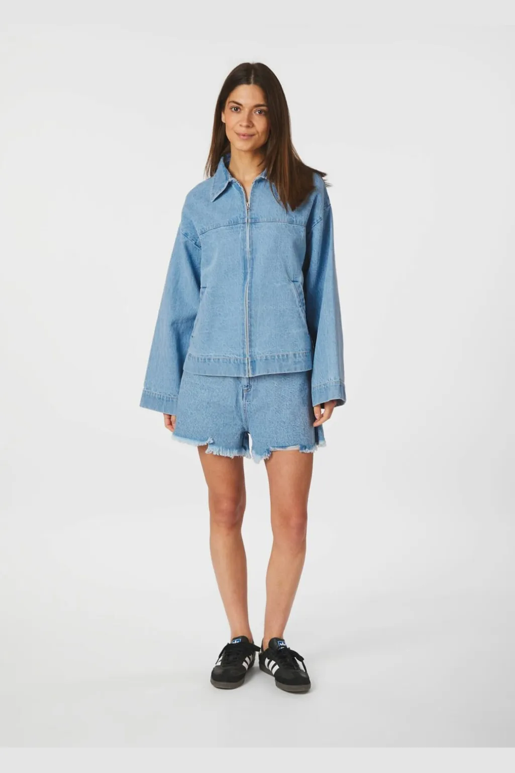 Denimjakke fra Neo Noir i lys blå. En oversize-model med flipkrave og lynlås foran. Jakken har praktiske sidelommer og er fremstillet i denimkvalitet.