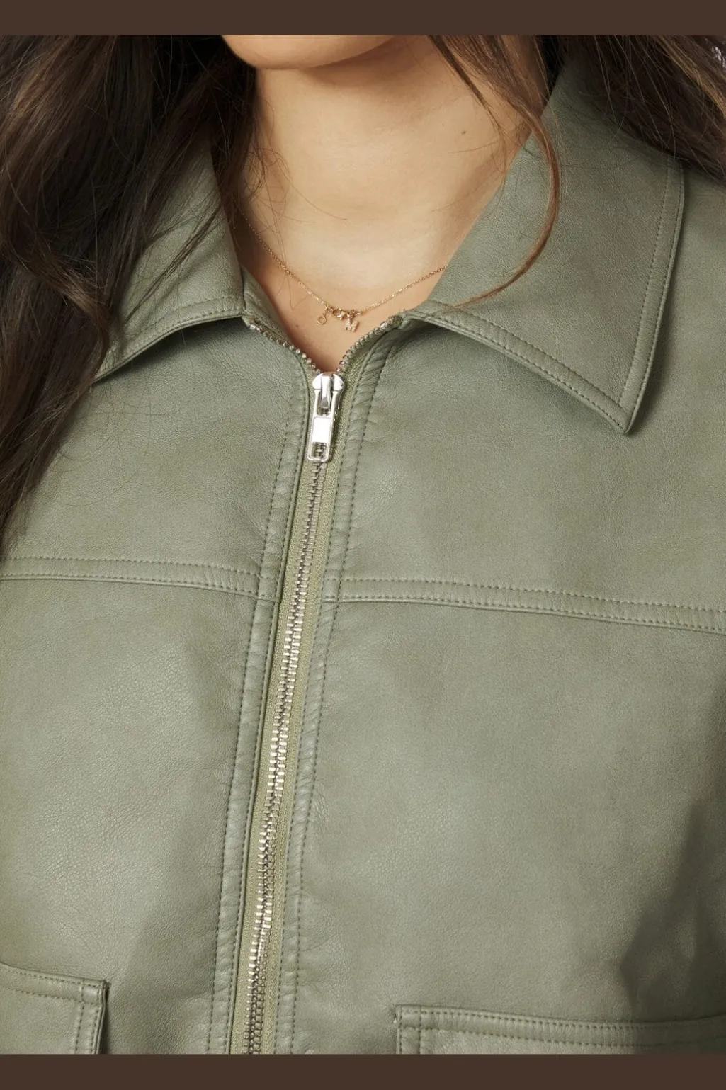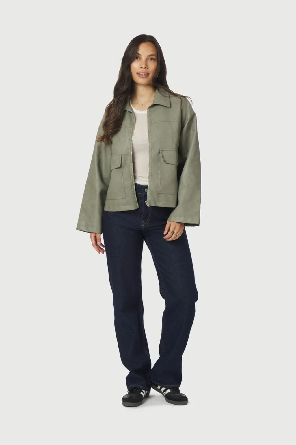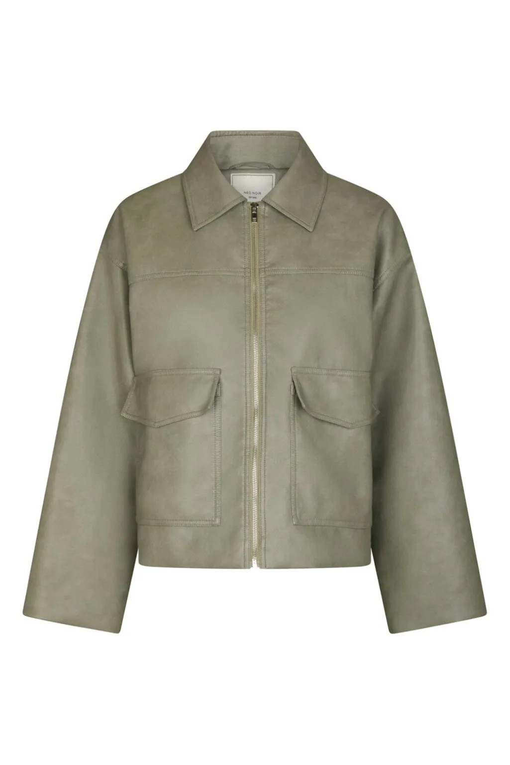Faux læderjakke fra Neo Noir i blød grøn nuance. Jakken har en oversize pasform med skjortekrave og lynlås foran. To store lommer med klap på forsiden giver jakken et praktisk design.