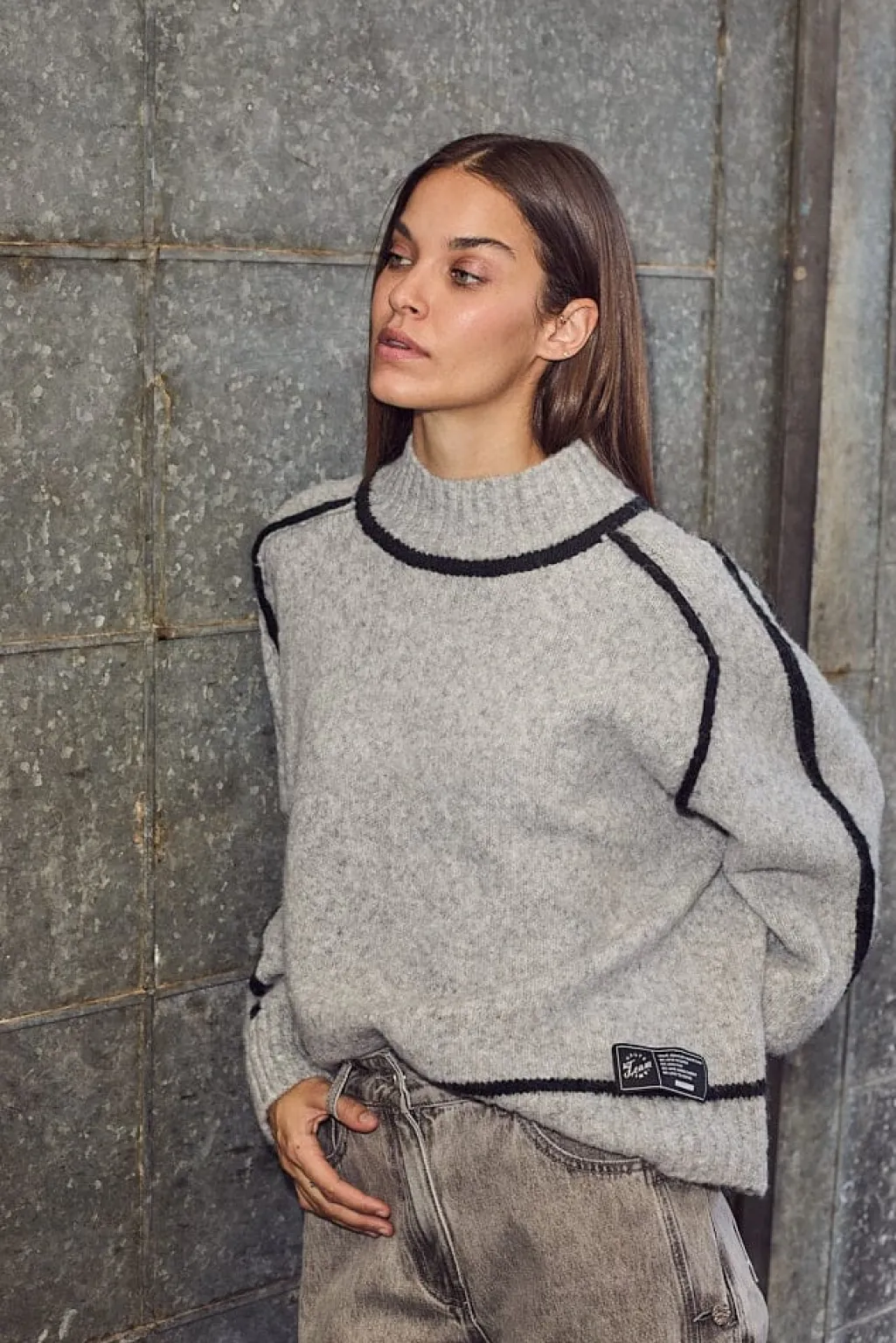 Striktrøje fra Haute L’Amitié i lys grå melange med sorte kantdetaljer langs sømmene. Strikken har en høj halsudskæring og lange ærmer.