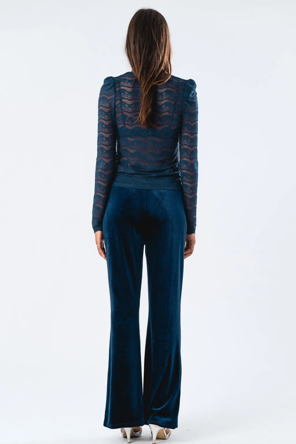 Mørkeblå blondebluse fra Lollys Laundry med lange ærmer. Blusen har et bølgende blondemønster og en V-halsudskæring.