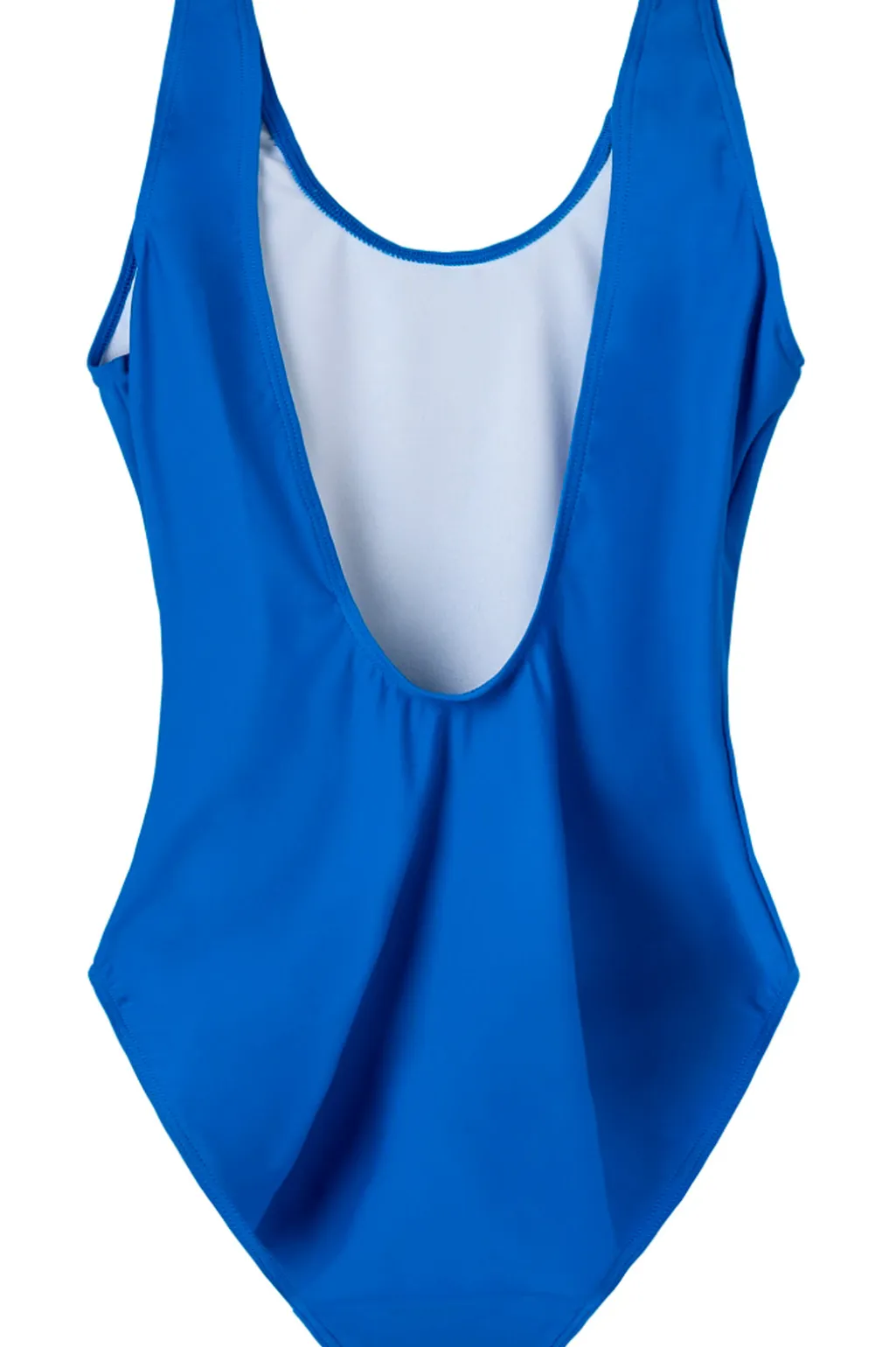 Sporty og feminin badedragt i et klassisk design med rund halsudskæring, højt bensnit og god pasform. Dyb rygudskæring.