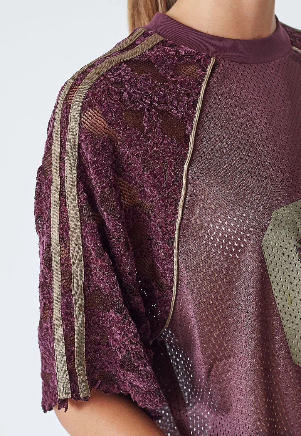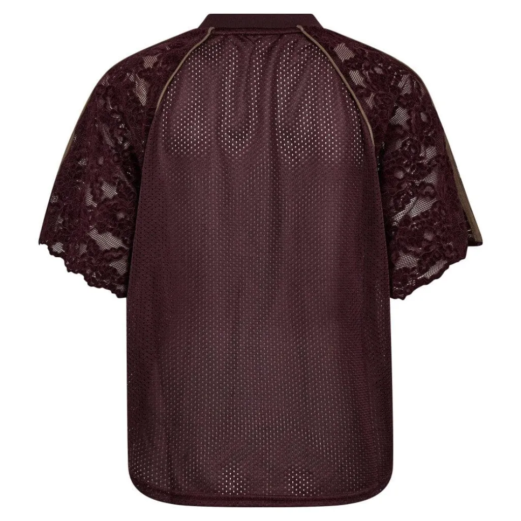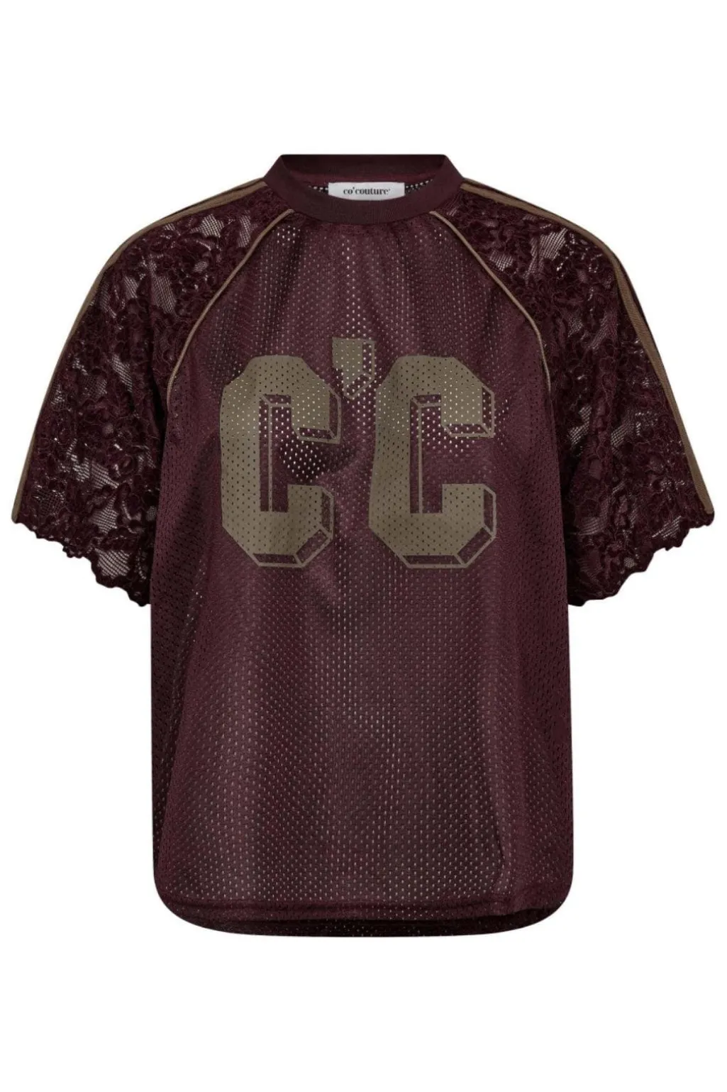 T-shirt fra Co´Couture med mesh-design på forsiden og ryggen. Ærmerne er lavet af blonder, og der er et stort C’C-logo på forsiden.