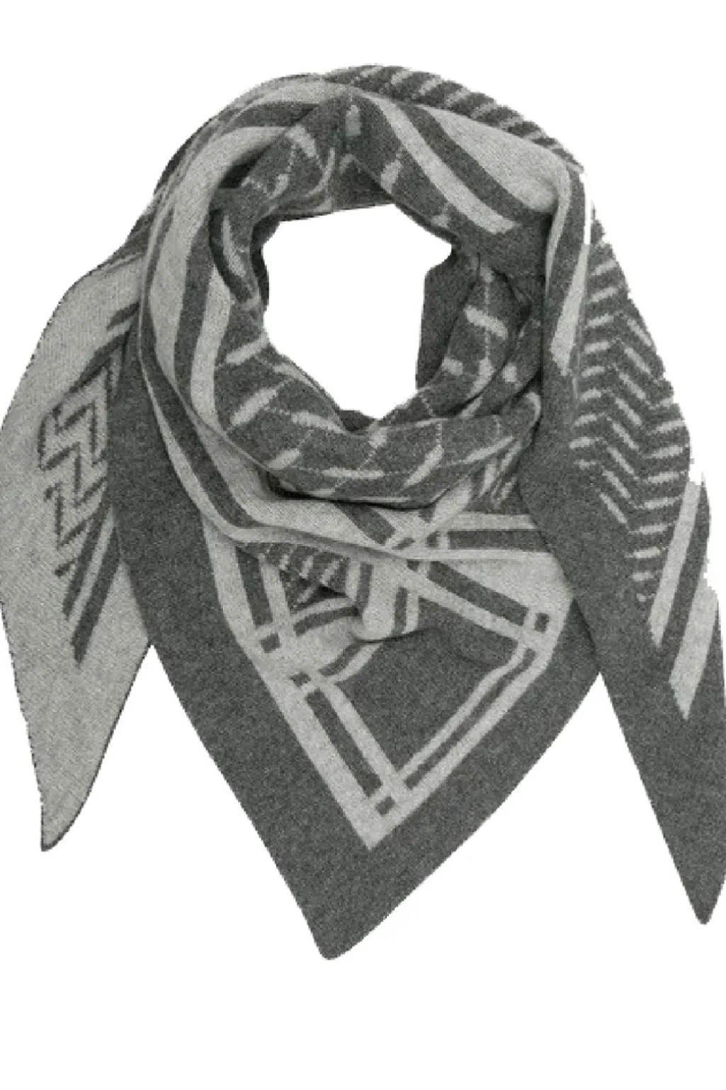 Trekantet tørklæde fra Lala Berlin i grå nuancer med geometrisk mønster. Det bløde cashmere-materiale kradser ikke på huden og giver god varme til halsen.