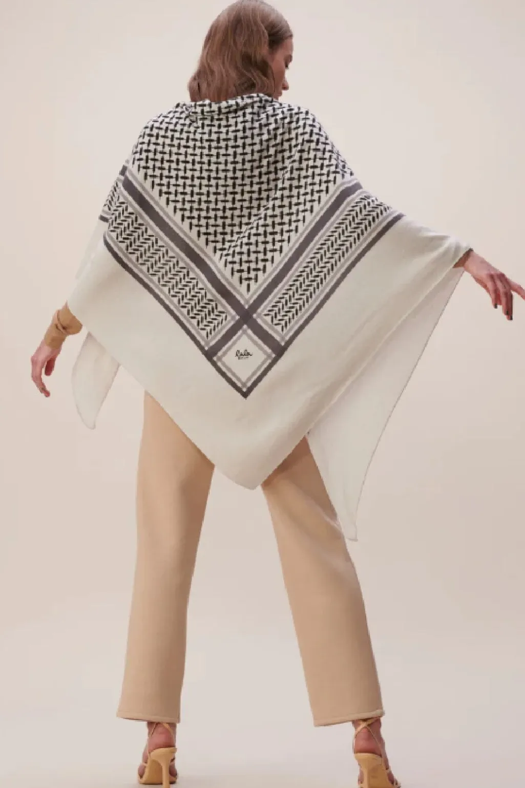 Trekantet tørklæde fra Lala Berlin i cremehvid uld med sort Kufiya-mønster. Det geometriske print følger tørklædets kanter og skaber et grafisk udtryk.