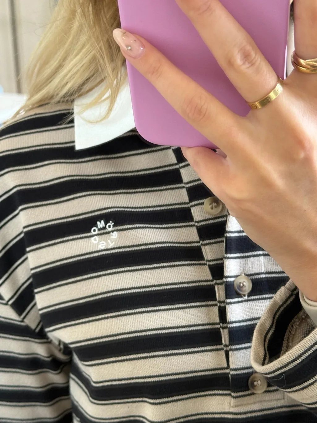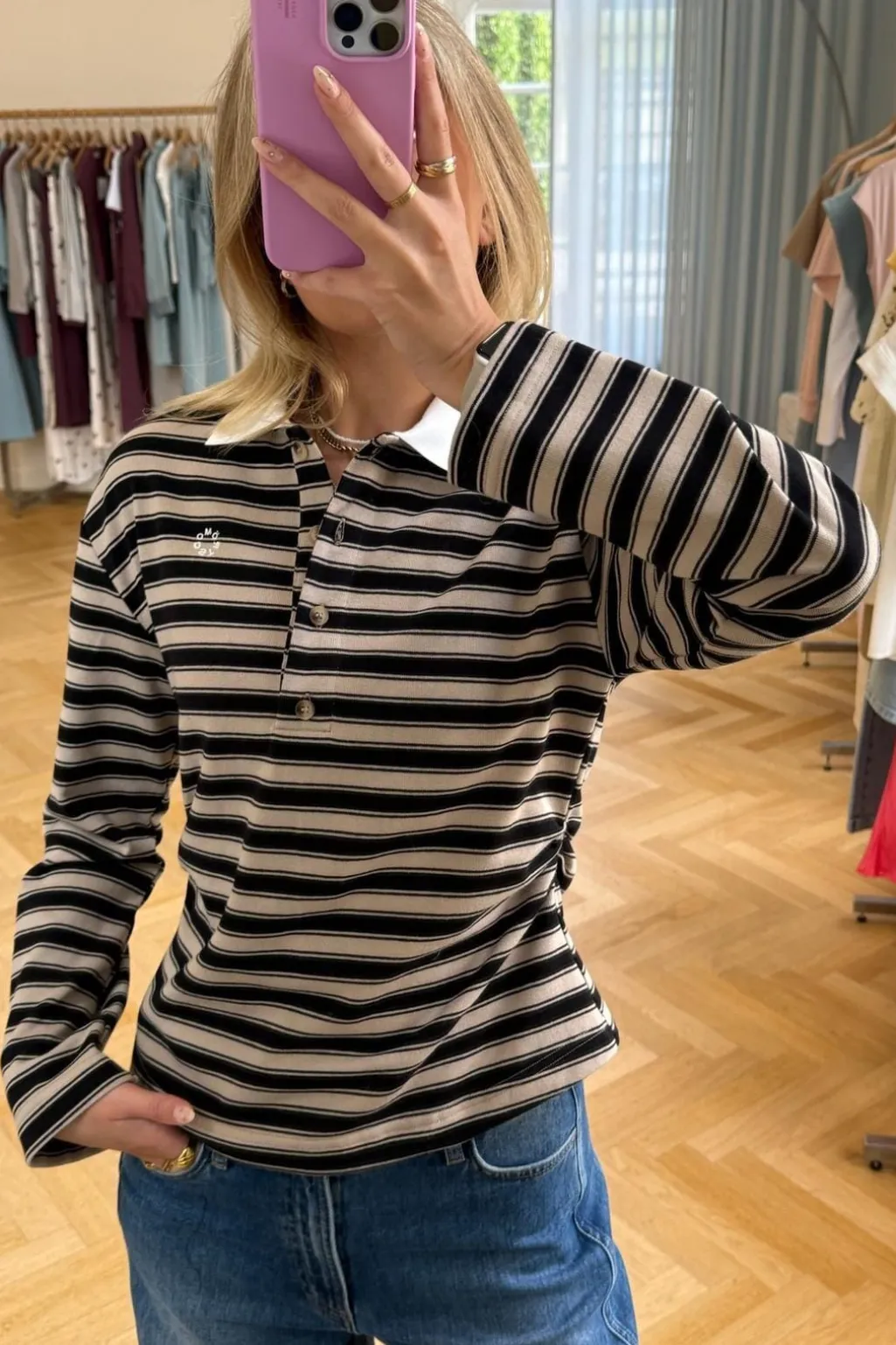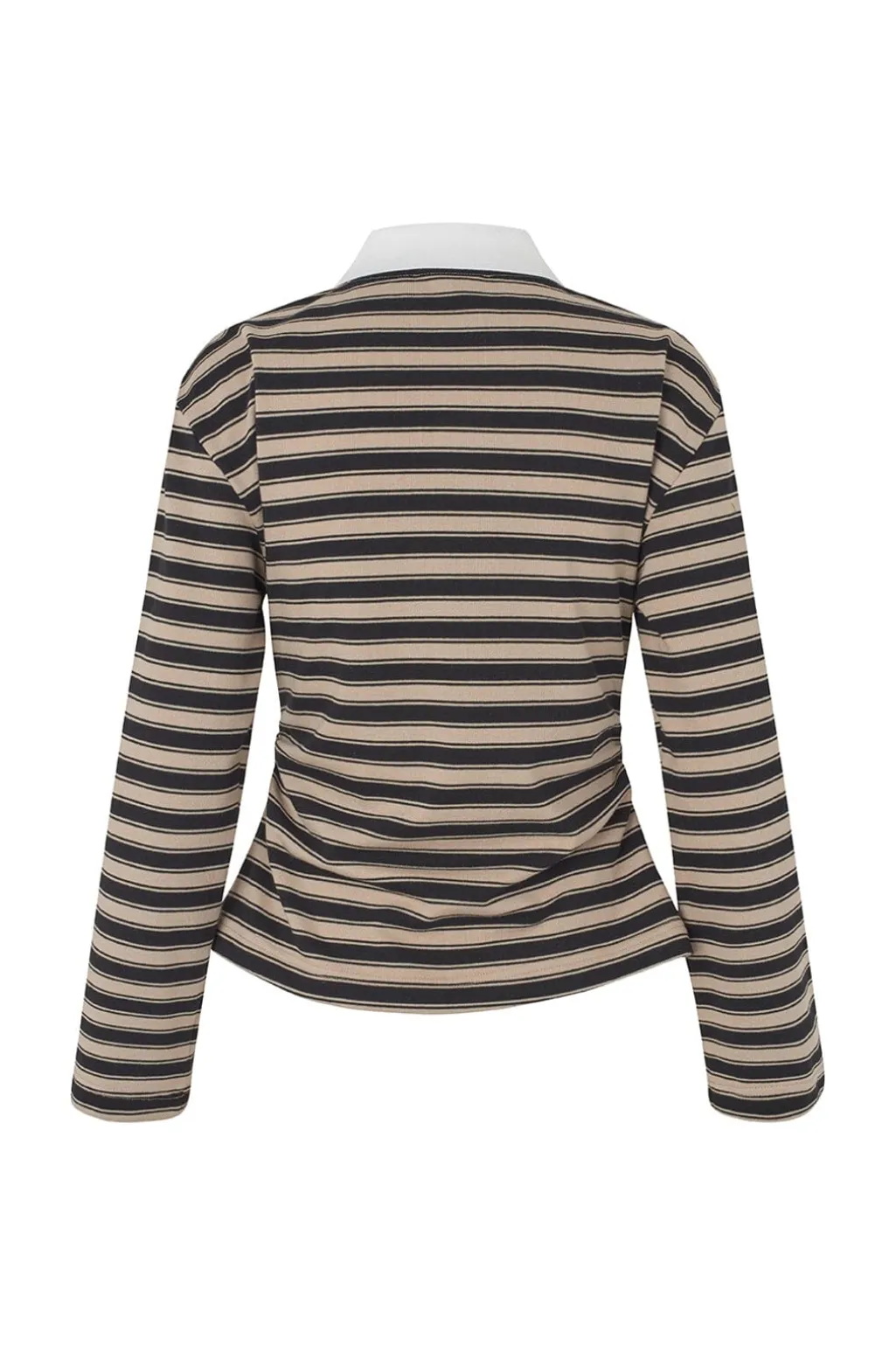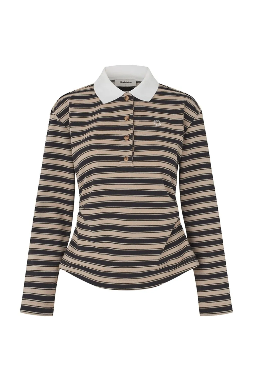 Stribet polo fra Modström med beige og sorte striber. Den hvide kontrastkrave og fire knapper foran giver poloen et klassisk udtryk, mens den lille broderede detalje på brystet tilføjer et personligt præg.