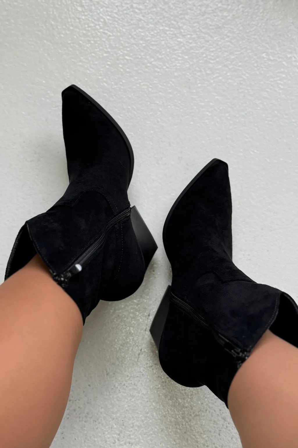 Sorte støvler fra Bloom, lavet af syntetisk materiale. Støvlerne har en spids tå, en mellemhøj blokhæl og en lynlås i siden.