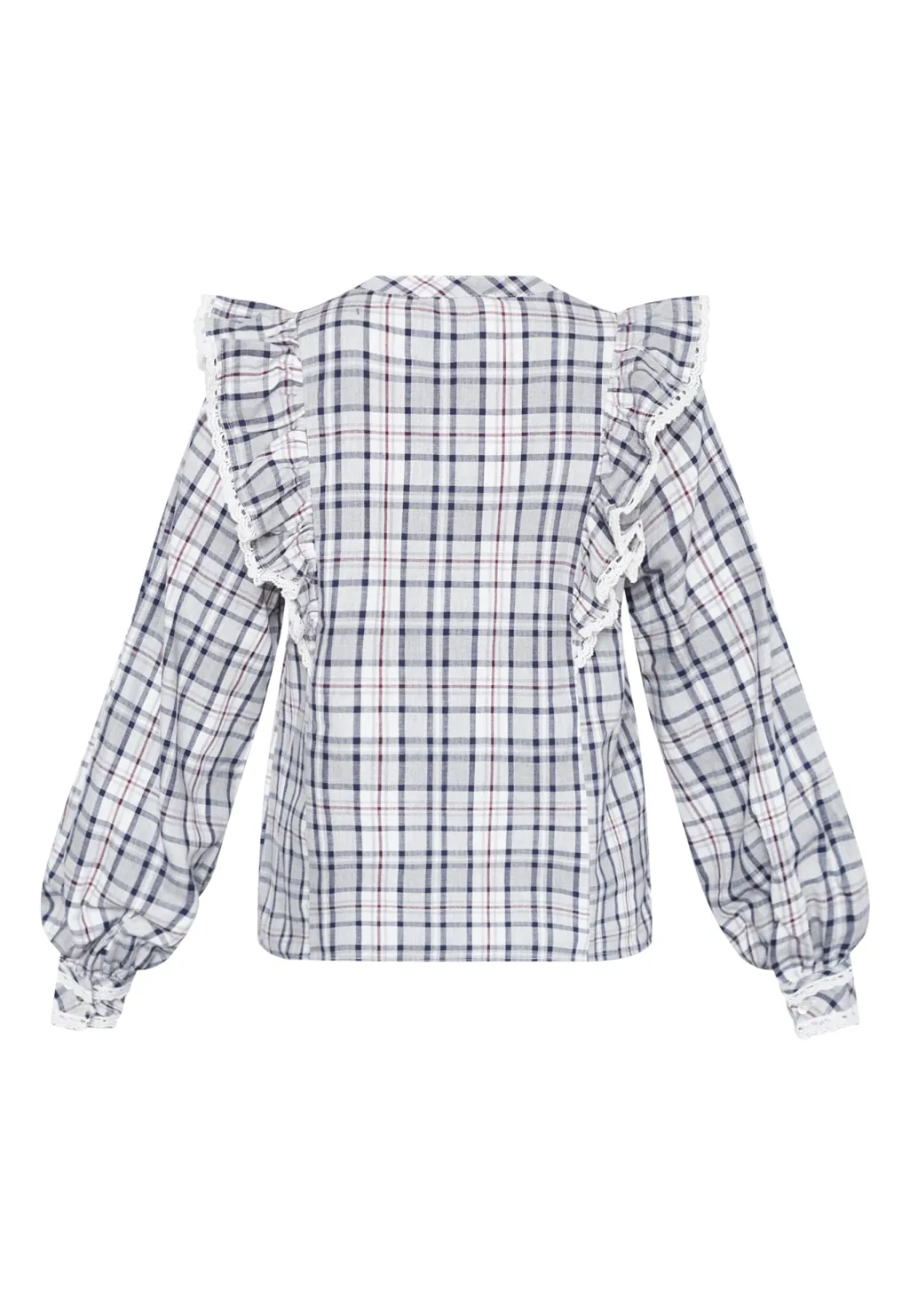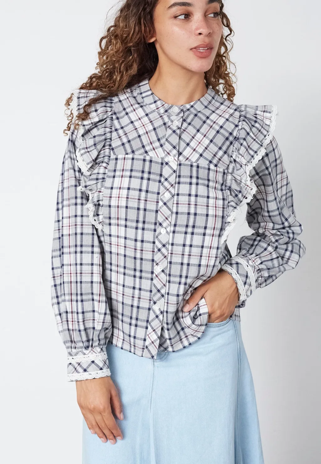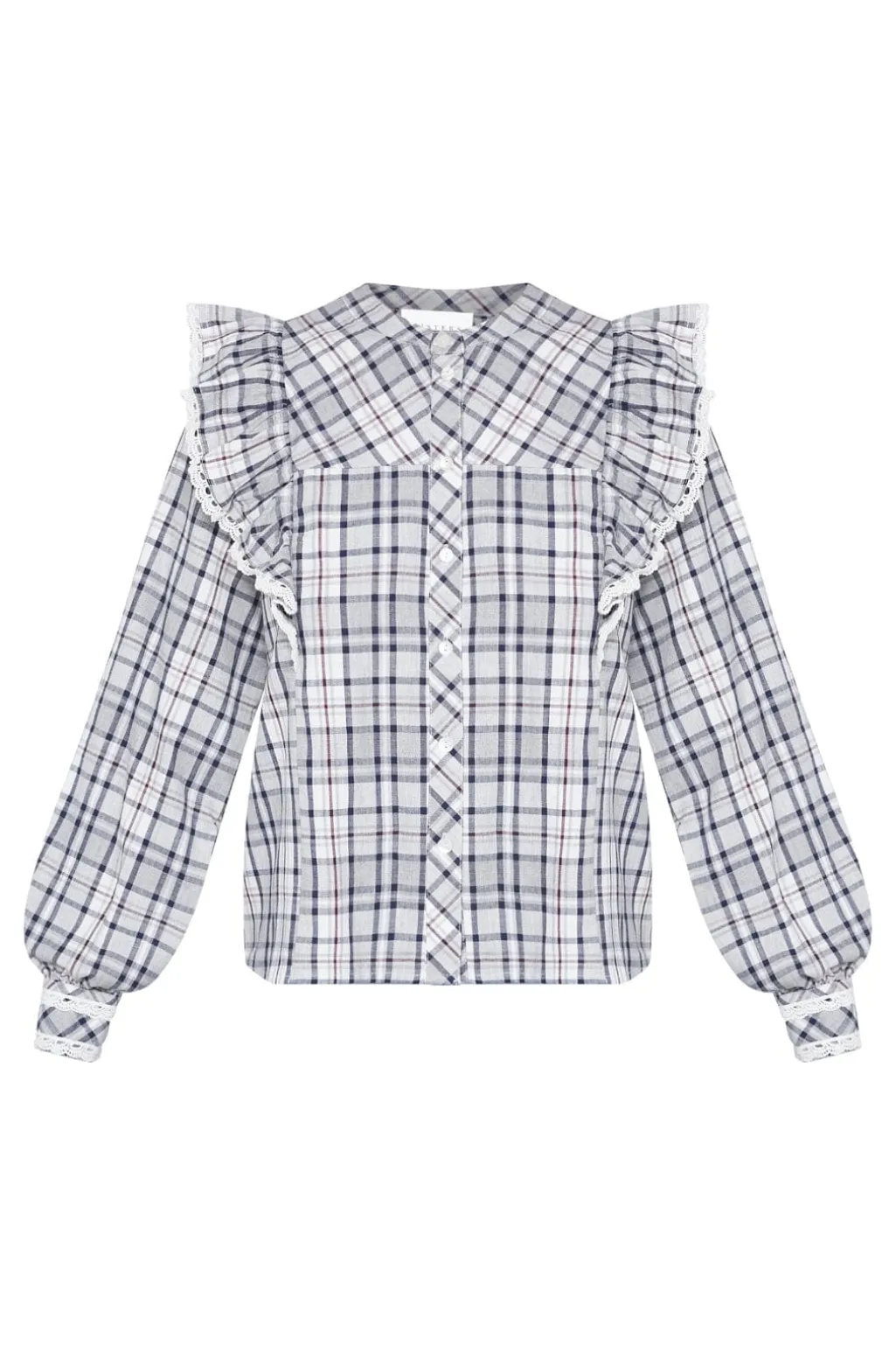 Ternet skjorte fra Sisters Point i grå nuancer med blå og hvide tern. Skjorten har en Peter Pan-krave og lange ærmer.