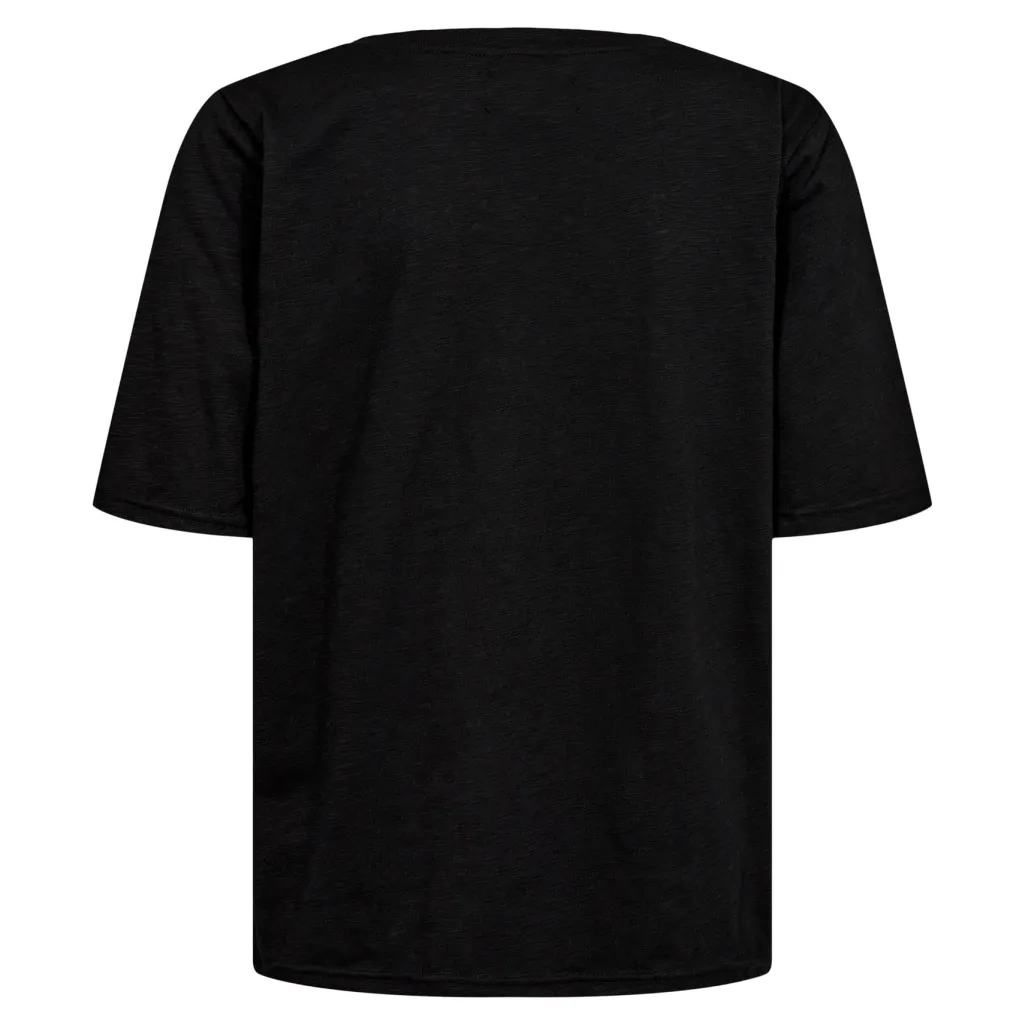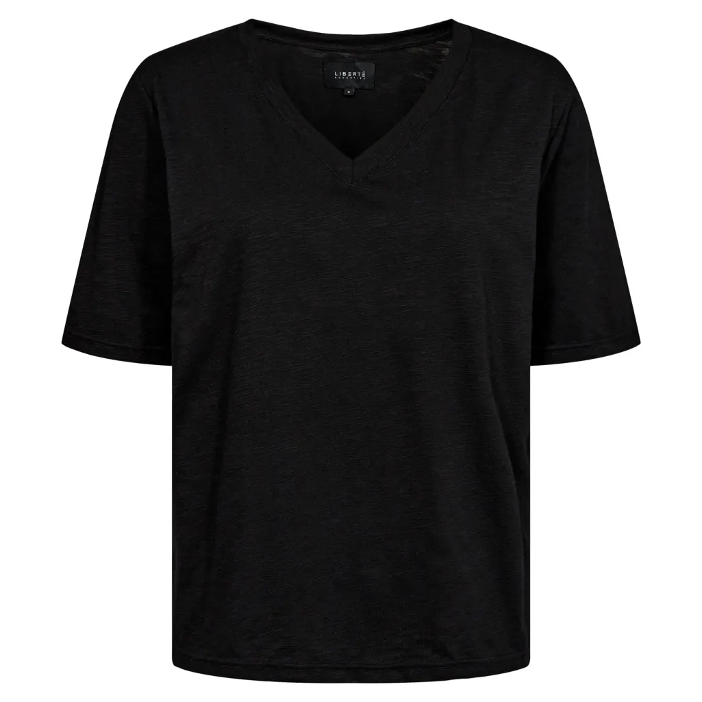 Sort t-shirt fra Liberte med V-udskæring og korte ærmer. T-shirten har en afslappet pasform og er lavet af en blanding af bomuld og polyester.