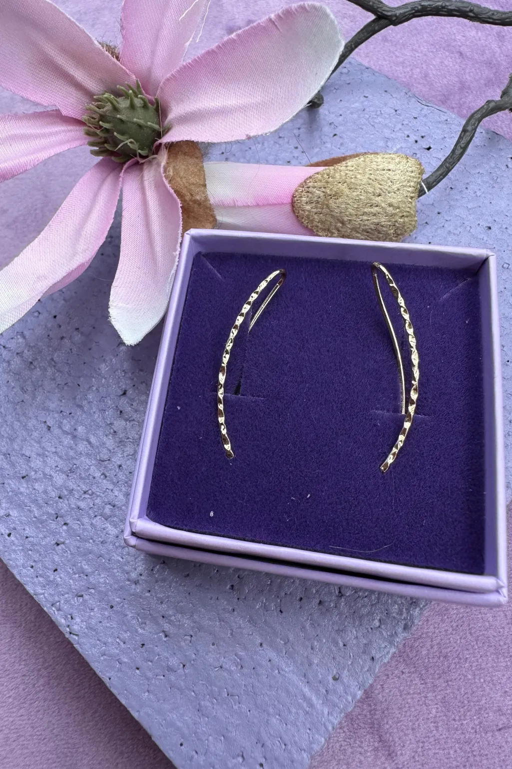 Forgyldte øreringe fra Mellow Moon med snoet tekstur. Øreringene følger ørets naturlige form og har et karakteristisk design med struktureret overflade.