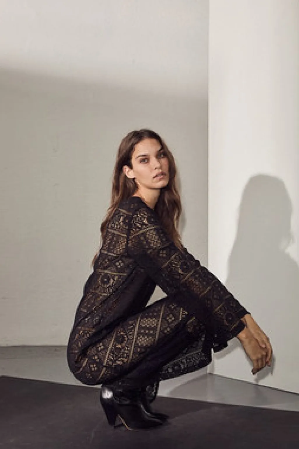 Sort blondekjole fra Haute L’Amitié med lange ærmer og geometrisk blondemønster. Kjolen har spændedetaljer ved ærmerne og en rund halsudskæring.