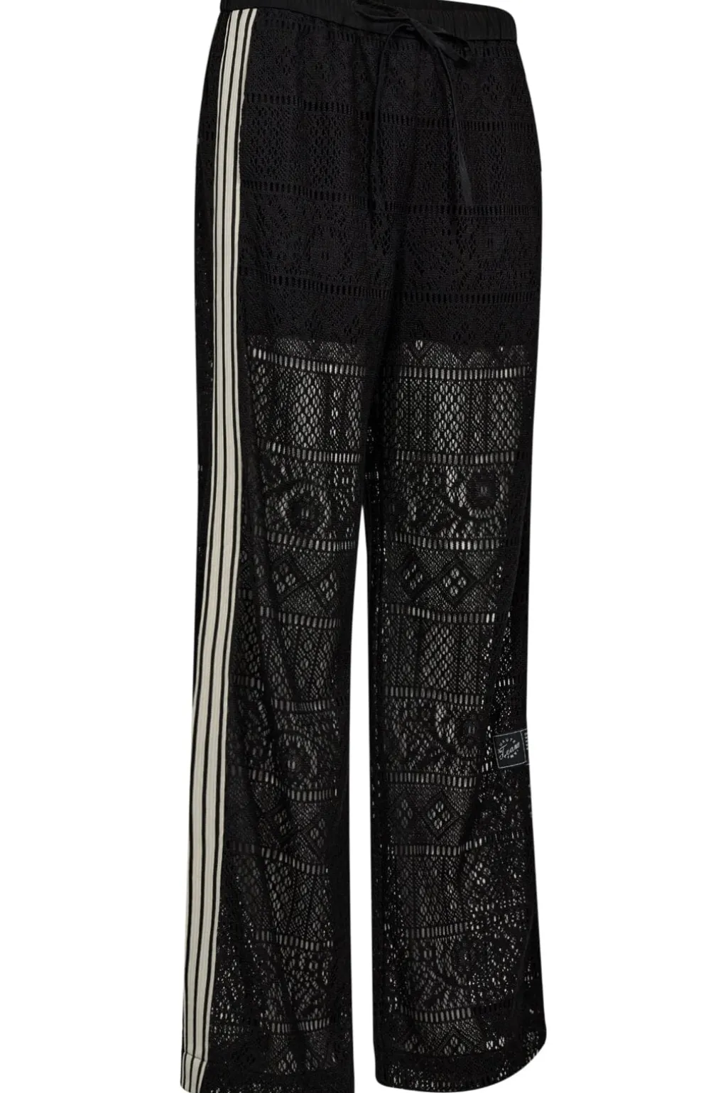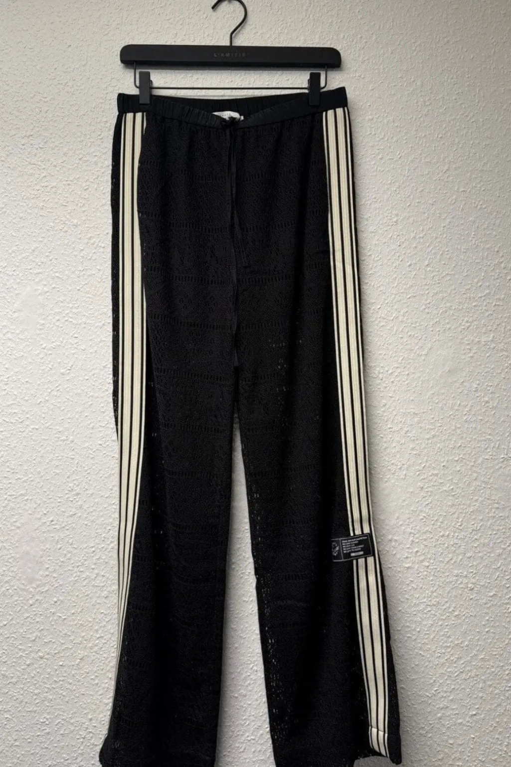 Sorte blondebukser fra Haute L’Amitié, lavet af 65 % bomuld og 35 % polyester. Bukserne har et stribet burnout-mønster med blondedetaljer og hvide striber langs siderne.