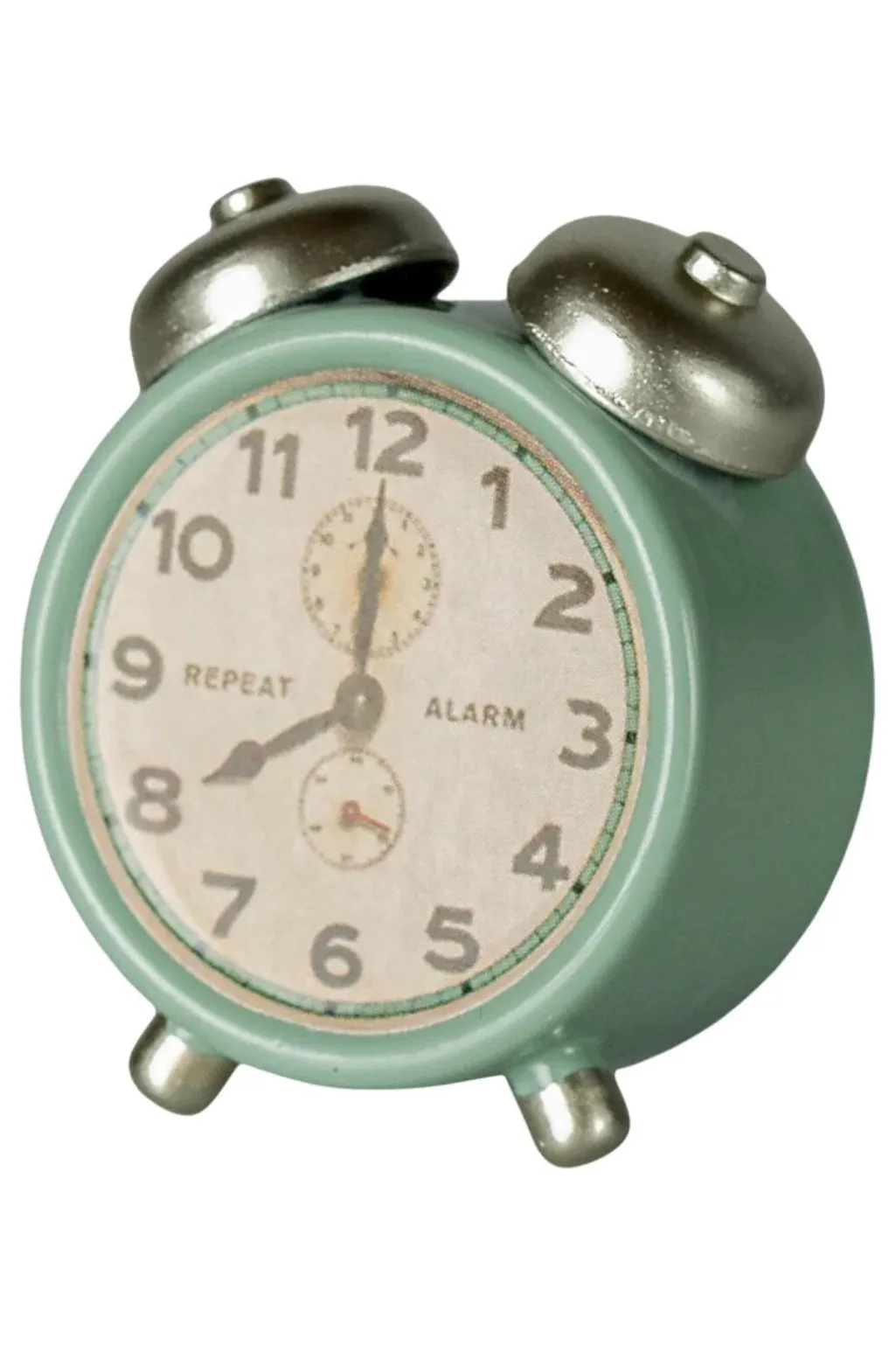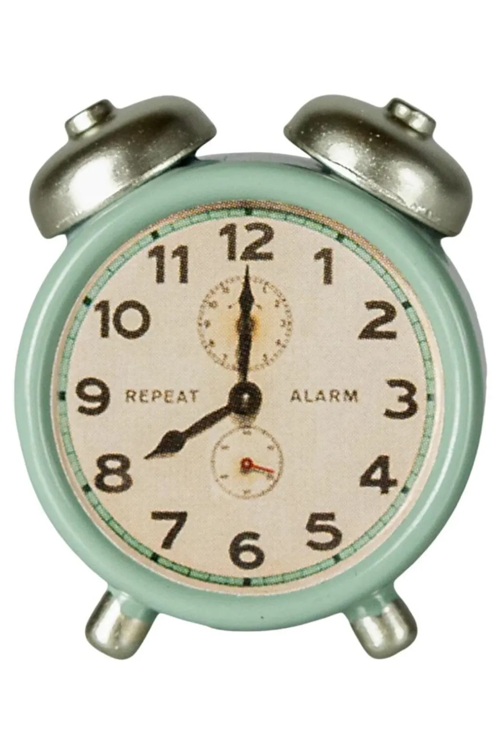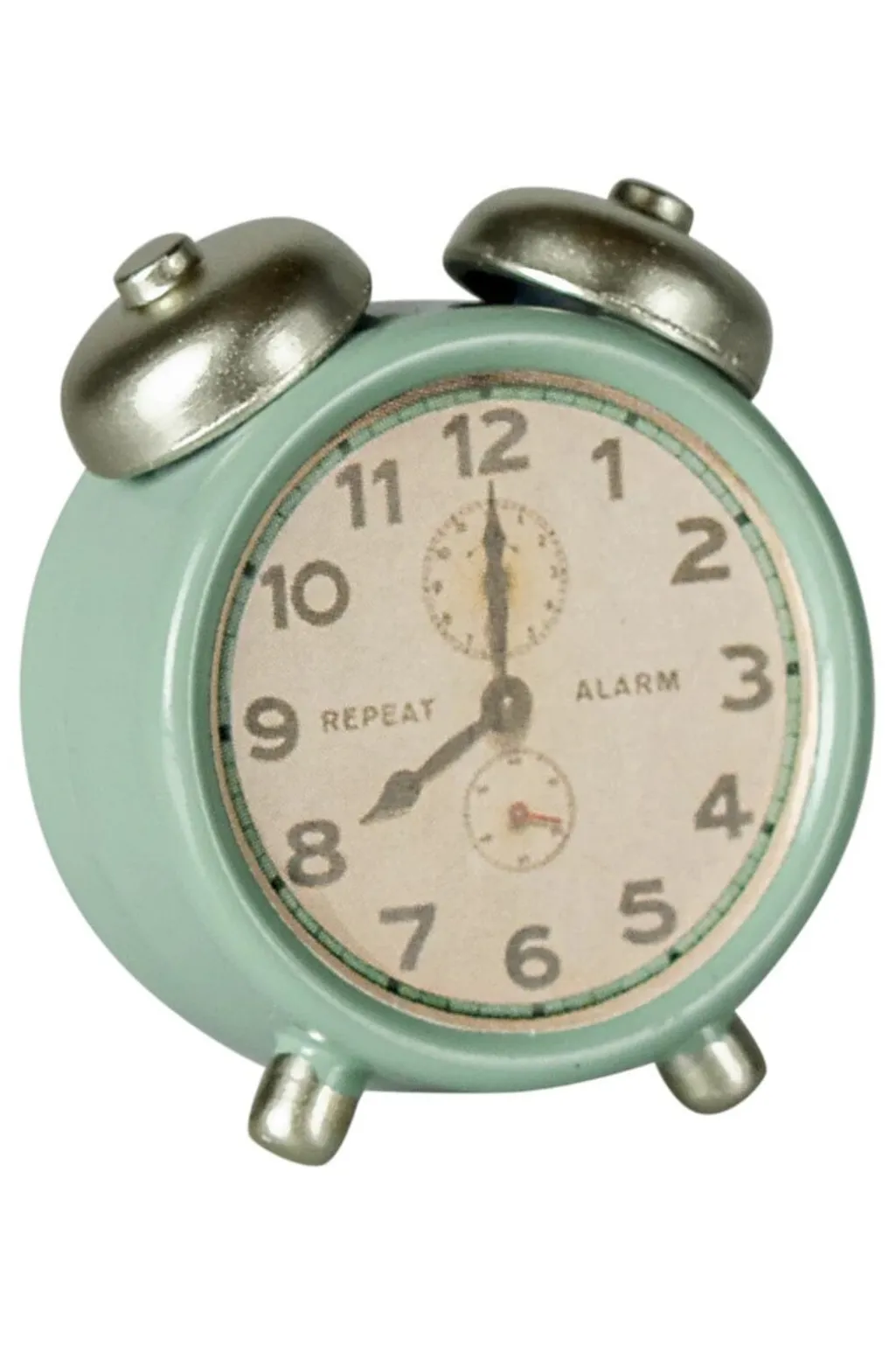Et mintgrønt vækkeur fra Maileg med sølvfarvede klokker. Uret har en tydelig urskive med tal og en alarmfunktion, der gør det til et funktionelt stykke legetøj.