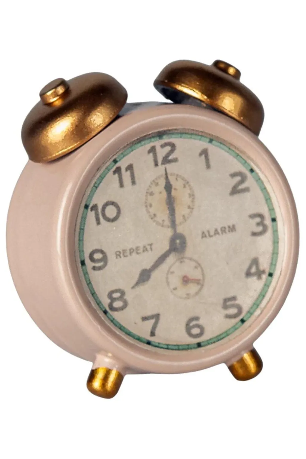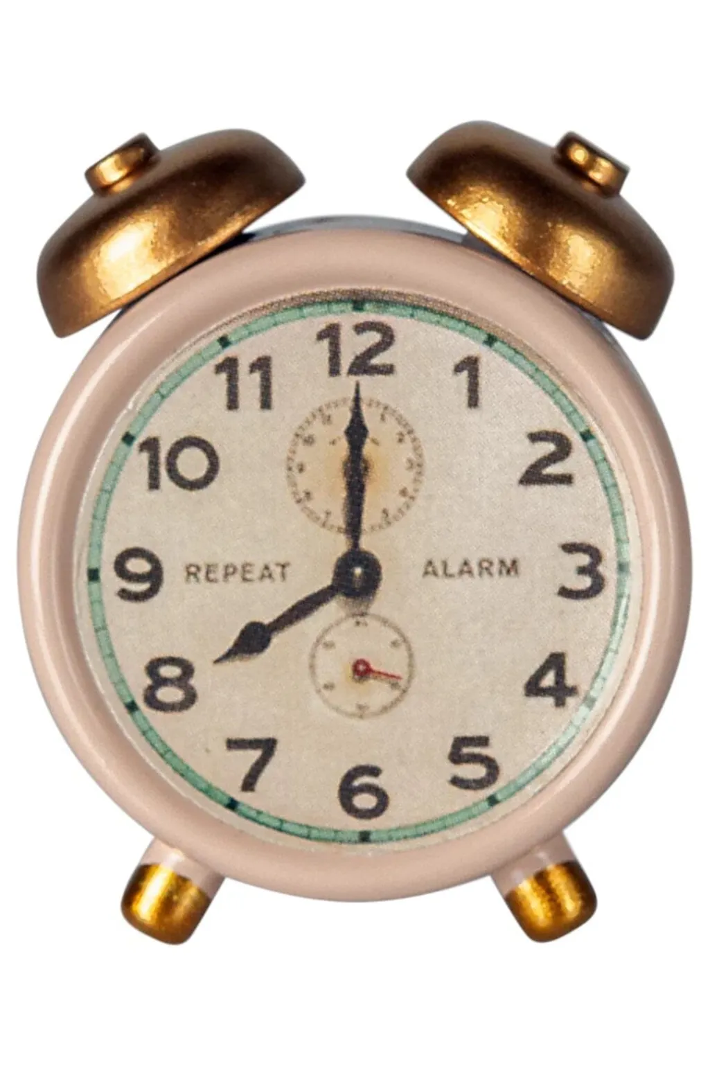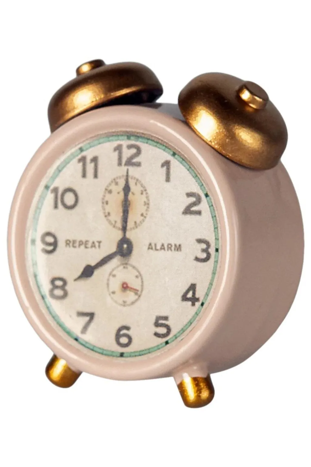 Et vækkeur fra Maileg i lyserød med gyldne detaljer. Uret har en klassisk form med to klokker på toppen og en tydelig urskive med tal og alarmfunktion.